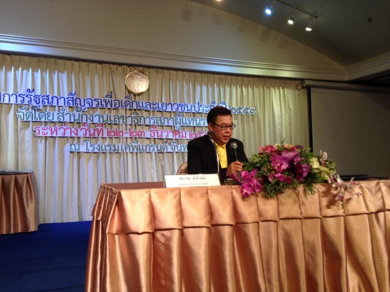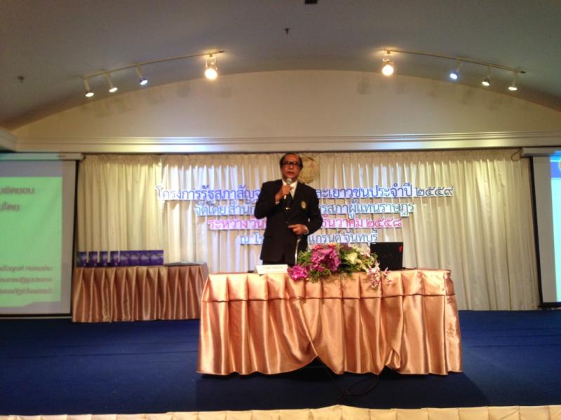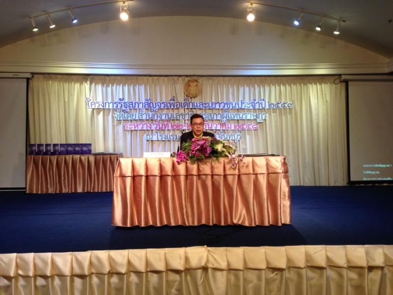 วันที่ ๒๒ - ๒๓ ธันวาคม ๒๕๕๘ ณ โรงแรมเคพี แกรนด์ อ.เมือง จ.จันทบุรี สำนักงานเลขาธิการสภาผู้แทนราษฎร โดยกลุ่มงานเผยแพร่ประชาธิปไตยและกิจกรรมสภาผู้แทนราษฎร จัดโครงการ "รัฐสภาสัญจรเพื่อเด็กและเยาวชน ปี ๒๕๕๙" โดยมี นายประวิช ตั้งใจมั่น ผู้อำนวยการสำนักประชาสัมพันธ์ กล่าวต้อนรับผู้เข้าร่วมโครงการ ซึ่งมีวัตถุประสงค์เพื่อเสริมสร้างความรู้เรื่อง บทบาท อำนาจหน้าที่ของสภานิติบัญญัติแห่งชาติ สมาขับเคลื่อนการปฏิรูปประเทศ และคณะกรรมการร่างรัฐธรรมนูญ ตลอดจนพัฒนาเครือข่ายเยาวชนให้มีความสามัคคี ปรองดองสมานฉันท์ เพื่อนำไปสู่การปฏิรูปประเทศไทยและพัฒนาประชาธิปไตยให้เข้มแข็ง โดยมีกลุ่มเป้าหมายเป็นเยาวชนที่กำลังศึกษาอยู่ในระดับมัธยมศึกษาตอนปลายของโรงเรียนในสังกัดเขตพื้นที่การศึกษามัธยมศึกษา (สพม.) ที่ ๑๗ จังหวัดจันทบุรี จำนวน ๑๒ โรงเรียน ทั้งนี้ เยาวชนจะได้เรียนรู้ทั้งภาคทฤษฎีและภาคประสบการณ์ ผ่านการบรรยาย เรื่อง "สิทธิ เสรีภาพ หน้าที่และความรับผิดชอบของพลเมืองตามวิถีประชาธิปไตย" จากนายไวกูณฑ์ ทองอร่าม สมาชิกสภาขับเคลื่อนการปฏิรูปประเทศ รวมทั้งการเสวนาแลกเปลี่ยนความคิดเห็นเกี่ยวกับ "บทบาทของเยาวชนกับการมีส่วนร่วมในการขับเคลื่อนประเทศ โดยวิทยากรผู้ทรงคุณวุฒิ ประกอบด้วย นายวรวิทย์ ศรีอนันต์รักษา สมาชิกสปท. นายวรวิทย์ พรหมคช ผู้อำนวยการสำนักงานเขตพื้นที่การศึกษามัธยมศึกษาเขต ๑๗ ผศ.ดร.โอฬาร ถิ่นบางเดียว รองคณบดีคณะรัฐศาสตร์และนิติศาสตร์ ม.บูรพา และนายฤทธิชัย อยู่สุข สื่อมวลชนท้องถิ่น เป็นผู้ดำเนินรายการ |