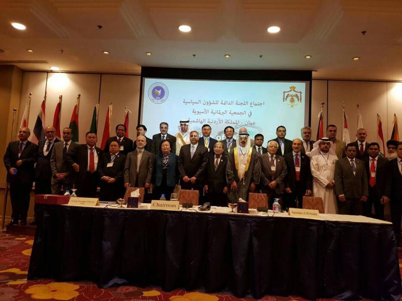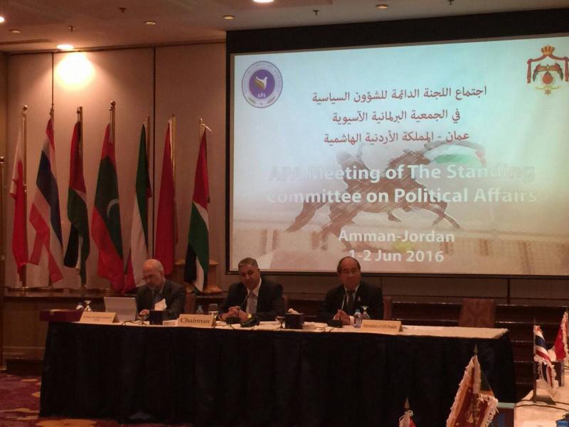 วันพฤหัสบดีที่ ๒ มิถุนายน ๒๕๕๙ พลเรือเอก อมรเทพ ณ บางช้าง หัวหน้าคณะผู้แทน สภานิติบัญญัติแห่งชาติในสมัชชารัฐสภาเอเชีย พร้อมด้วยพลเอก นิพัทธ์ ทองเล็ก สมาชิกสภานิติบัญญัติแห่งชาติเข้าร่วมการประชุมคณะกรรมาธิการว่าด้วยการเมืองของสมัชชารัฐสภาเอเชีย ณ โรงแรมเชอราตัน กรุงอัมมาน ราชอาณาจักรฮัชไมต์จอร์แดน การประชุมครั้งนี้มีผู้แทนจาก ๑๓ ประเทศเข้าร่วม โดยมี นายชีฮาดาห์ อาบูห์ดาอิบ จากจอร์แดน ประธานคณะกรรมาธิการว่าด้วยการเมืองของสมัชชารัฐสภาเอเชียกล่าวเปิดประชุมและนายชิต คิม เยียต ผู้แทนประธานสมัชชารัฐสภาเอเชีย กล่าวขอบคุณรัฐสภาจอร์แดน เจ้าภาพการประชุมครั้งนี้ซึ่งจัดขึ้นตามวัตถุประสงค์ของสมัชชารัฐสภาเอเชียต่อจากนั้น ดร. มาซูด อิสลามี รองเลขาธิการสมัชชารัฐสภาเอเชีย ปฏิบัติหน้าที่เลขาธิการสมัชชารัฐสภาเอเชีย เสนอรายงานต่อที่ประชุม โดยเห็นว่าสมาชิกควรพิจารณาการดำเนินการที่เป็นรูปธรรมในการปฏิบัติตามข้อมติต่างๆ ภายหลังจากนั้นหัวหน้าคณะผู้แทนจากแต่ละประเทศได้อภิปรายแสดงความเห็นในประเด็นต่างๆ ที่เกี่ยวข้อง ทั้งนี้ พลเรือเอก อมรเทพ ณ บางช้าง หัวหน้าคณะผู้แทนสภานิติบัญญัติแห่งชาติ ได้กล่าวอภิปรายขอบคุณจอร์แดนเจ้าภาพจัดการประชุมว่าประเทศไทยอยู่ในช่วงเปลี่ยนผ่าน ซึ่งประชาธิปไตยของไทยอาจแตกต่างจากสากลไปบ้าง อันเนื่องมาจากวัฒนธรรมของไทย แต่สิ่งที่สำคัญคือต้องเป็นประชาธิปไตยที่นำมาซึ่ง ความอยู่ดีกินดีและความเจริญรุ่งเรืองของประชาชน นอกจากนี้ เพื่อสันติภาพในเอเชีย มิตรภาพและ ความร่วมมือเป็นสิ่งสำคัญ รัฐสภามีหน้าที่ให้คำแนะนำให้รัฐบาลปฏิบัติตามข้อมติที่ที่ประชุมรับรอง เพื่อประโยชน์ของประเทศ การประณามการก่อการร้ายเป็นสิ่งสำคัญ แต่ไม่ควรประณามองค์กร หรือประเทศหนึ่งประเทศใด ปีนี้ครบรอบ ๕๐ ปี ความสัมพันธ์ทางการทูตของไทยและจอร์แดน ในโอกาสนี้เป็นเรื่องที่น่ายินดีที่จอร์แดนจะตั้งสถานเอกอัครราช ทูตจอร์แดน ณ กรุงเทพฯในเวลาอันใกล้นี้ ในภาคบ่าย ที่ประชุมเห็นชอบตามข้อเสนอของรองเลขาธิการสมัชชารัฐสภาเอเชียซึ่งเสนอให้ปรับชื่อเป็นร่างข้อมติฉบับใหม่ ๔ ฉบับ และที่ประชุมร่วมกันพิจารณาปรับแก้เนื้อหาแต่ละฉบับ ทำให้มีร่างข้อมติ ๔ ฉบับ ดังนี้ คือ ๑) ร่างข้อมติว่าด้วยการสร้างความเจริญรุ่งเรืองในเอเชียด้วยมิตรภาพและความร่วมมือ ๒) ร่างข้อมติว่าด้วยรัฐสภาและรัฐบาลร่วมมือเพื่อความเจริญรุ่งเรืองในเอเชีย ๓)ร่างข้อมติว่าด้วยร่วมมือต่อต้าน การก่อการร้ายและการนิยมความรุนแรงสุดขั้ว 