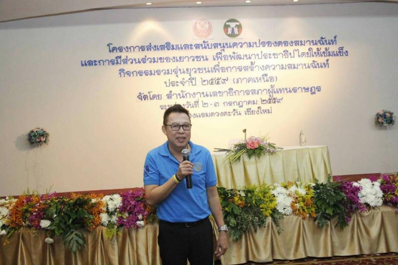 วันเสาร์ที่ ๒ กรกฎาคม ๒๕๕๙ เวลา ๐๙.๓๐ นาฬิกา ณ โรงแรมดวงตะวัน เชียงใหม่ อำเภอเมืองจังหวัดเชียงใหม่ สำนักงานเลขาธิการสภาผู้แทนราษฎร ได้จัดกิจกรรมรวมรุ่นยุวชนเพื่อสร้างความสมานฉันท์ภาคเหนือ ประจำปี ๒๕๕๙ ระหว่างวันที่ ๒-๓ กรกฎาคม ๒๕๕๙ ขึ้น โดยมี นายประวิช ตั้งใจมั่น ที่ปรึกษาด้านระบบงานนิติบัญญัติ กล่าวต้อนรับผู้เข้าร่วมกิจกรรม และนางจงเดือน สุทธิรัตน์ ผู้อำนวยการสำนักประชาสัมพันธ์ ได้กล่าวชี้แจงถึงวัตถุประสงค์และแนวทางการดำเนินกิจกรรมฯ ดังกล่าวว่า มีวัตถุประสงค์เพื่อให้ความรู้เกี่ยวกับสิทธิ เสรีภาพ หน้าที่และความรับผิดชอบของพลเมืองในระบอบประชาธิปไตยตามวิถีรัฐธรรมนูญ การสร้างความสามัคคี ปรองดองสมานฉันท์ ระหว่างเครือข่ายยุวชนประชาธิปไตยของรัฐสภา การแลกเปลี่ยนความรู้และประสบการณ์ในการดำเนินการจัดโครงการ/กิจกรรม ตลอดจนการทำกิจกรรมบำเพ็ญประโยชน์สาธารณะแก่สังคมผ่านกิจกรรม CSR ทั้งนี้ มีผู้เข้าร่วมสัมมนา ประกอบด้วยคณะกรรมการยุวชนประชาธิปไตยภาคเหนือ เยาวชนโรงเรียนภาคีเครือข่ายของยุวชนประชาธิปไตยจังหวัดเชียงใหม่และตัวแทน ยุวชนประชาธิปไตยภูมิภาค จำนวน ๑๗๐ คน |