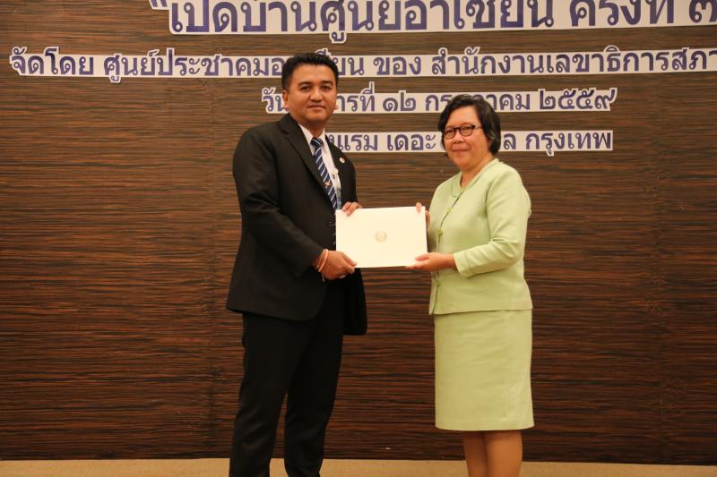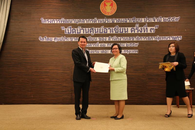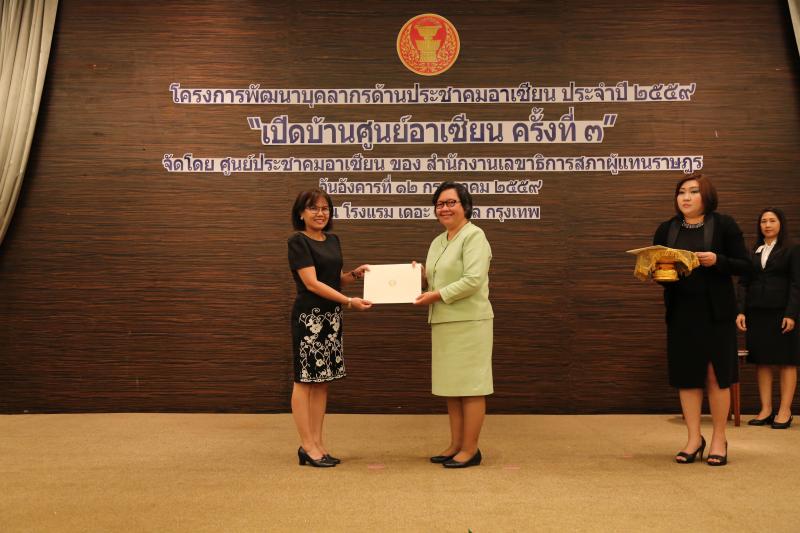 | วันนี้ ( 12 ก.ค. 59)เวลา 15.30 นาฬิกาณ ห้องกมลทิพย์ โรงแรมเดอะสุโกศล กรุงเทพ นางสาวสุภาสินี ขมะสุนทร รองเลขาธิการสภาผู้แทนราษฎร เป็นประธานในพิธีมอบเกียรติบัตร แก่ผู้ผ่านการฝึกอบรมเชิงปฏิบัติการหลักสูตรการสร้างความรู้ ความเข้าใจ ทักษะ สมรรถนะแก่บุคลากรในด้านกฎหมายระหว่างประเทศ ที่เกี่ยวกับประชาคมอาเซียน ครอบคลุมสามเสาหลักของประชาคมอาเซียน |