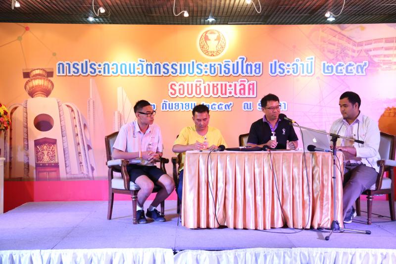 และสามารถสร้างความเข้าใจในความหมายของ นวัตกรรมประชาธิปไตย ได้อย่างแท้จริงต่อมาเป็นการนำเสนอผลงานบนเวที และตอบข้อซักถามของคณะอนุกรรมการตัดสินผลงาน รอบชิงชนะเลิศ การประกวดนวัตกรรมประชาธิปไตย ประจำปี ๒๕๕๙ ประกอบด้วย รองศาสตราจารย์โกวิทย์ พวงงาม ประธานอนุกรรมการ รองศาสตราจารย์พิชาย รัตนดิลก