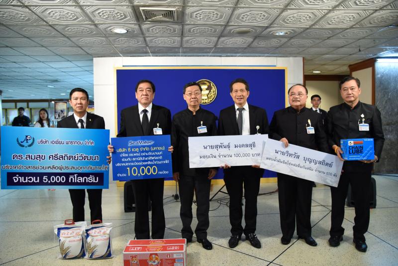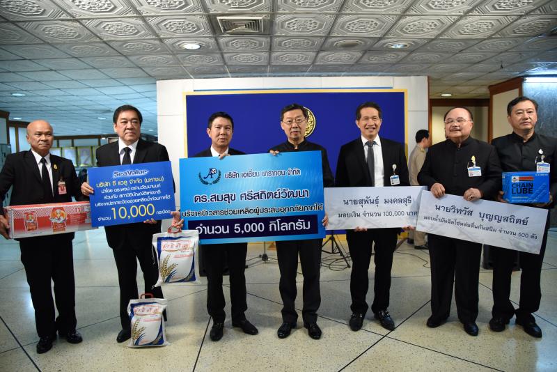 จำนวน ๕ ตัน ๒. นายพจน์ อร่ามวัฒนานนท์ มอบปลากระป๋อง จำนวน ๑๐,๐๐๐ กระป๋อง ๓. นายวิทวัส บุญญสถิต มอบน้ำมันฉีดโซ่หล่อลื่นกันสนิม จำนวน ๕๐๐ ลัง ๔. นายสุพันธุ์ มงคลสุธี บริจาคเงิน ๑๐๐,๐๐๐ บาท ๕. พันตำรวจโท พงษ์ชัย วราชิต บริจาคเงิน ๑๐๐,๐๐๐ บาท ทั้งนี้ รองประธานสภานิติบัญญัติแห่งชาติ คนที่หนึ่ง กล่าวว่า จะนำสิ่งของต่าง ๆ