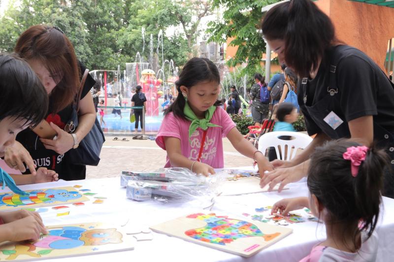 ฐานกิจกรรมบริเวณหน้างานอย่างคึกคัก อาทิ ระบายสีตุ๊กตาปูนปลาสเตอร์ ต่อจิ๊กซอว์ ร้อยเข็มมือเดียว งานประดิษฐ์