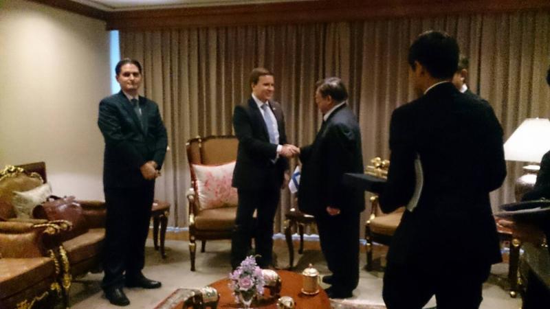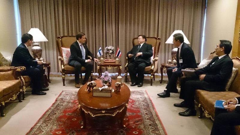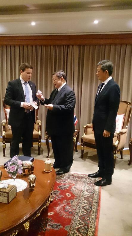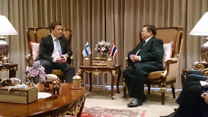 | วันพุธที่ ๑๗ พฤษภาคม ๒๕๖๐ เวลา ๑๕.๐๐ นาฬิกา ณ กระทรวงการต่างประเทศ นายฉัตรชัย ปิยะสมบัติกุล ประธานกลุ่มมิตรภาพสมาชิกรัฐสภาไทย-ฟินแลนด์ นำนาย Ville Tavio ประธานกลุ่มมิตรภาพรัฐสภาระหว่างฟินแลนด์-ไทย เข้าเยี่ยมคารวะ นายวีระศักดิ์ ฟูตระกูล รัฐมนตรีช่วยว่าการกระทรวงการต่างประเทศ |