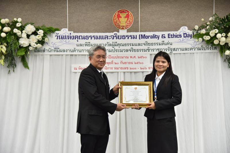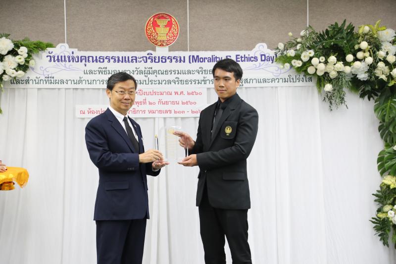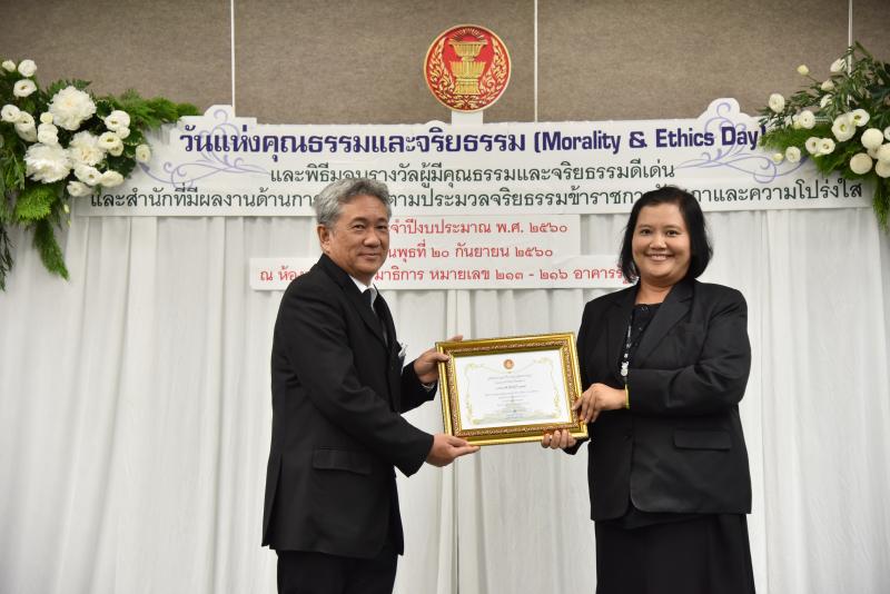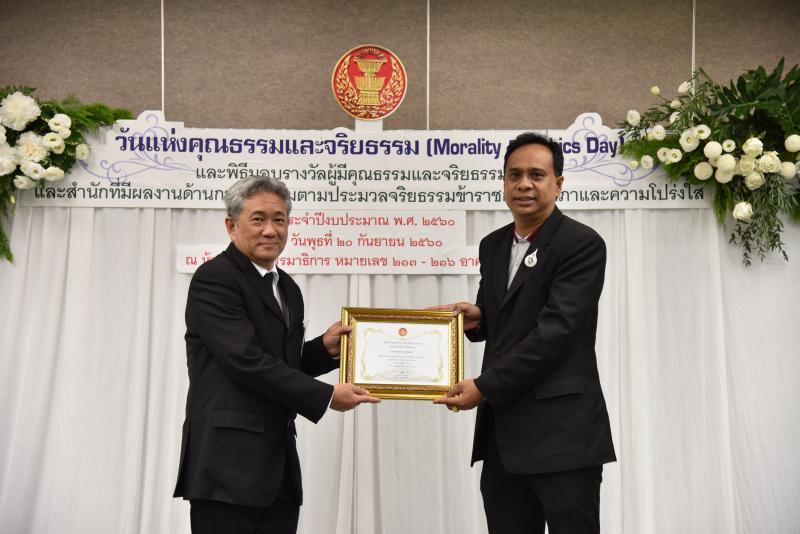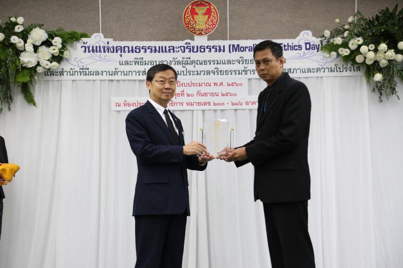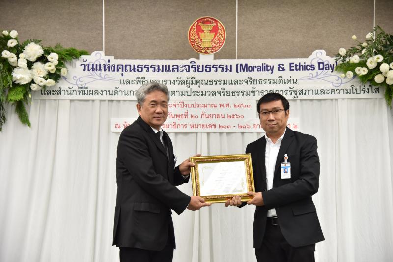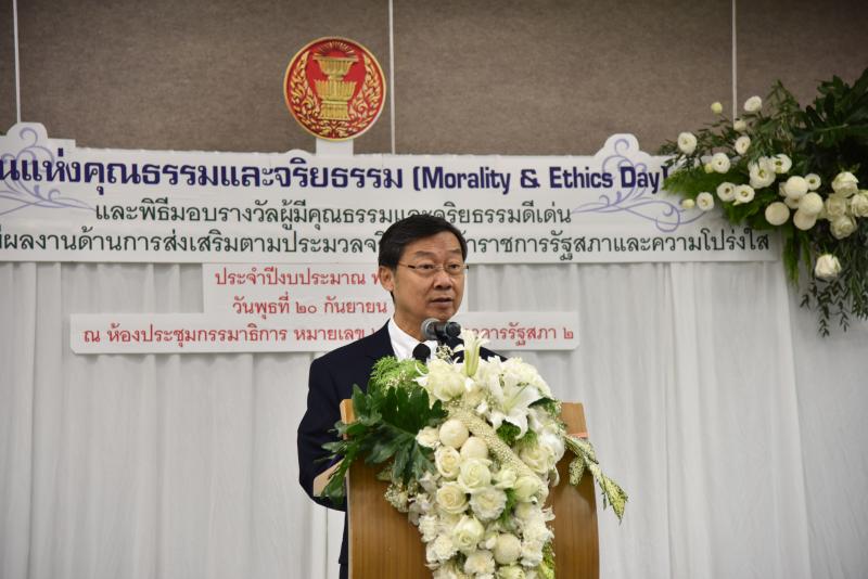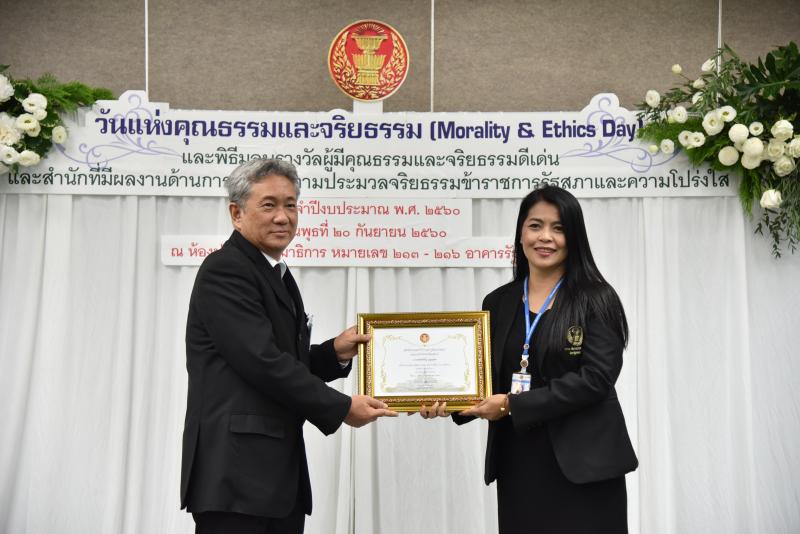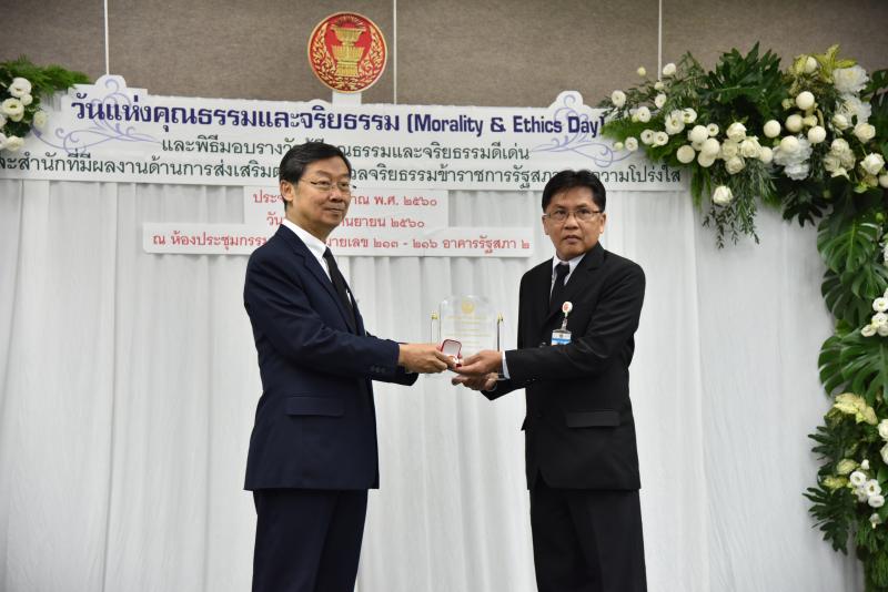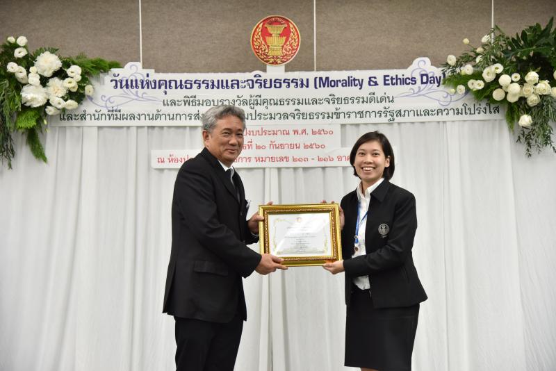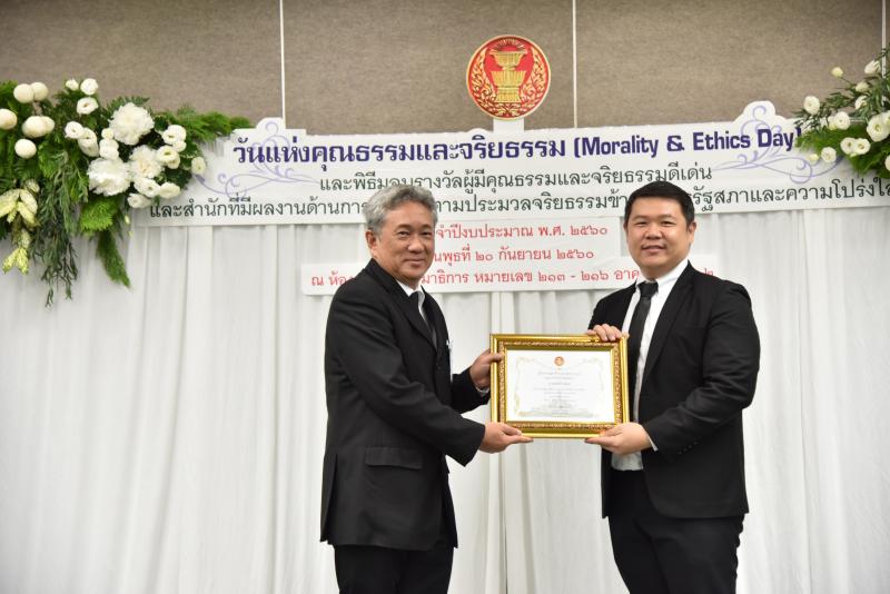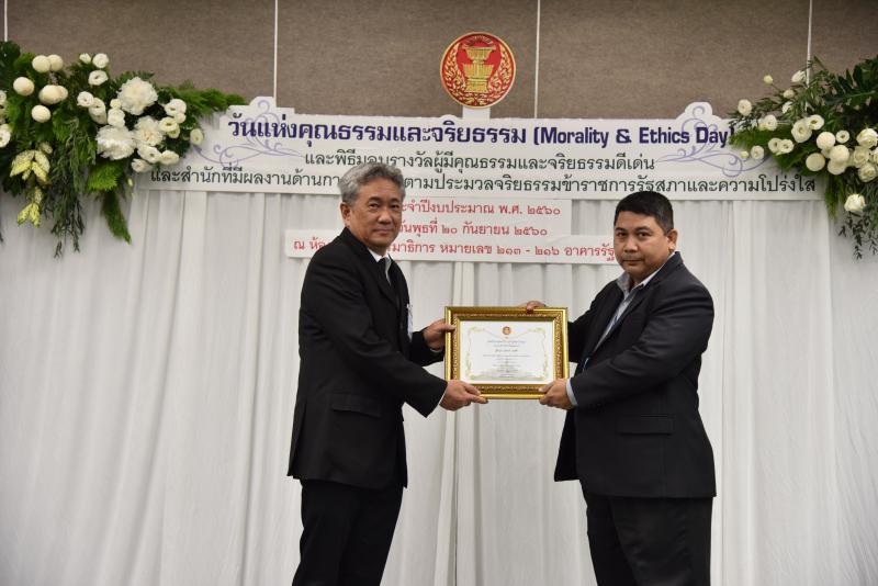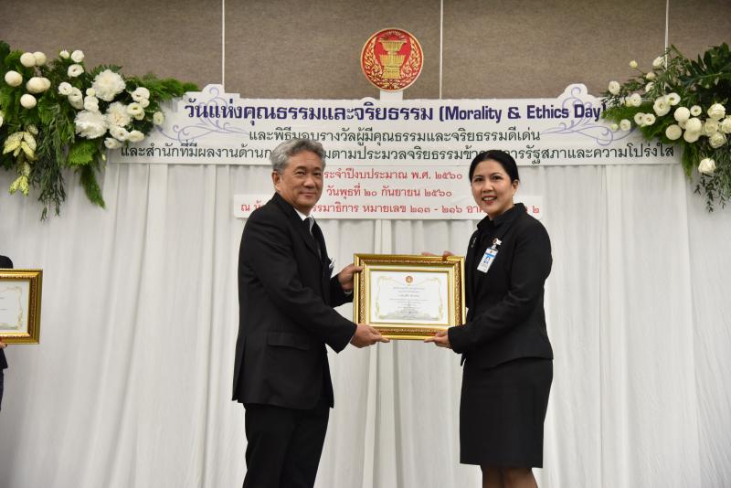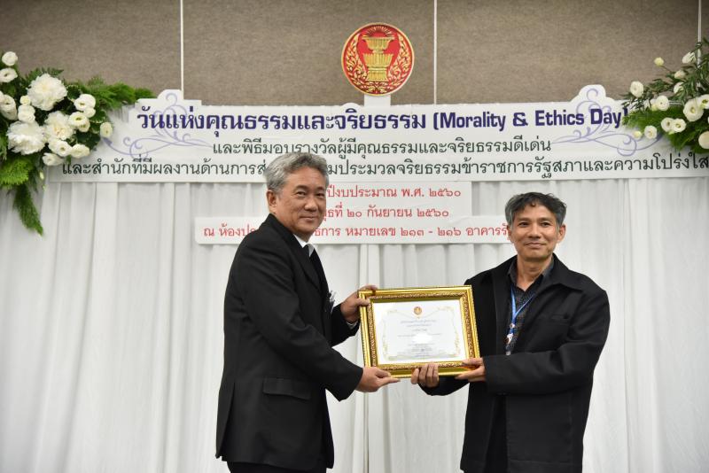วันพุธที่ ๒๐ กันยายน ๒๕๖๐เวลา ๑๓.๐๐ นาฬิกา ณ ห้องประชุมคณะกรรมาธิการ หมายเลข ๒๑๓ ๒๑๖ ชั้น ๒ อาคารรัฐสภา ๒ นายสุรชัย เลี้ยงบุญเลิศชัยรองประธานสภานิติบัญญัติแห่งชาติ คนที่หนึ่ง เป็นประธานในพิธีมอบรางวัลให้แก่ข้าราชการรัฐสภา ที่ได้รับคัดเลือกเป็นข้าราชการรัฐสภาผู้มีคุณธรรมและจริยธรรมดีเด่น และสำนักที่มีผลงานด้านการส่งเสริมตามประมวลจริยธรรมข้าราชการรัฐสภาและความโปร่งใส ประจำปีงบประมาณ พ.ศ. ๒๕๖๐ และข้าราชการที่ได้รับรางวัลการประกวดตั้งชื่อเว็บไซต์ของคณะกรรมการจริยธรรมข้าราชการรัฐสภาในโครงการส่งเสริมการปฏิบัติตามประมวลจริยธรรมข้าราชการรัฐสภา : วันแห่งคุณธรรมและจริยธรรม (Morality & Ethics Day) โดยมีนายสรศักดิ์ เพียรเวช เลขาธิการสภาผู้แทนราษฎร กล่าวรายงานทั้งนี้ รองประธานสภานิติบัญญัติแห่งชาติ คนที่หนึ่ง มอบเข็มเชิดชูเกียรติ และโล่ยกย่องประกาศเกียรติคุณ แก่ข้าราชการ พนักงานราชการ และลูกจ้าง ของสำนักงานเลขาธิการวุฒิสภา และสำนักงานเลขาธิการสภาผู้แทนราษฎร ที่ได้รับคัดเลือกเป็นข้าราชการรัฐสภาผู้มีคุณธรรมและจริยธรรมดีเด่น จำนวน ๘ คน ได้แก่ ๑. ประเภทวิชาการ - นางศศิธร ธรรมธินโน วิทยากรชำนาญการ กลุ่มงานคณะกรรมาธิการสิทธิมนุษยชน สิทธิ เสรีภาพและการคุ้มครองผู้บริโภค สำนักกรรมาธิการ ๓ สำนักงานเลขาธิการวุฒิสภา - นางสาวสิริธร ลิมปพยอม ผู้บังคับบัญชากลุ่มงานบริหารงานบุคคล สำนักบริหารงานกลาง สำนักงานเลขาธิการสภาผู้แทนราษฎร ๒. ประเภททั่วไป - นางหทัยรัตน์ สัจจัง เจ้าพนักงานธุรการชำนาญงาน กลุ่มงานบริหารทั่วไปและพิธีการ สำนักประชาสัมพันธ์ สำนักงานเลขาธิการวุฒิสภา - นายรังสรรค์ สุภคุต เจ้าพนักงานธุรการชำนาญงาน กลุ่มงานประธานสภาผู้แทนราษฎร สำนักงานประธานสภาผู้แทนราษฎร สำนักงานเลขาธิการสภาผู้แทนราษฎร ๓. ประเภทพนักงานราชการ - นายคมศักดิ์ บุญเปลื้อง นักวิชาการผลิตโสตทัศน์ กลุ่มงานฝึกอบรมและสัมมนา สำนักพัฒนาทรัพยากรบุคคล สำนักงานเลขาธิการวุฒิสภา - นายเจษฎา พรหมย้อย นักวิชาการรัฐศาสตร์ สังคมศาสตร์และศึกษาศาสตร์ คณะกรรมาธิการสื่อสารและโทรคมนาคม สำนักกรรมาธิการ ๑ สำนักงานเลขาธิการสภาผู้แทนราษฎร ๔. ประเภทลูกจ้าง - นายรุ่งโรจน์ สาหร่ายทอง คนสวน กลุ่มงานอาคารและสถานที่ สำนักบริหารงานกลาง สำนักงานเลขาธิการวุฒิสภา - นายวิมพ์วาทิต เผ่าพิมพา พนักงานพิมพ์ออฟเซท กลุ่มงานโรงพิมพ์และสำเนาสิ่งพิมพ์ สำนักการพิมพ์ สำนักงานเลขาธิการสภาผู้แทนราษฎร จากนั้นรองประธานสภานิติบัญญัติแห่งชาติ คนที่หนึ่ง มอบโล่ประกาศเกียรติค