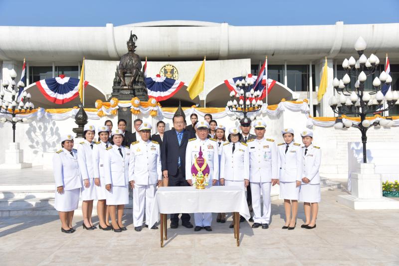 เลขาธิการสภาผู้แทนราษฎร พร้อมด้วยคณะทำงานช่วยดูแลรักษาและบริหารกิจการสโมสรรัฐสภา นำพานประดับพุ่มดอกไม้ถวายบังคม ในนาม “สโมสรรัฐสภา” เนื่องในงานพระราชพิธีฉลองวันพระราชทานรัฐธรรมนูญแห่งราชอาณาจักรไทย