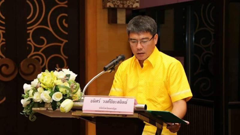 กล่าวรายงานนายธนิศร์ วงศ์ปิยะสถิตย์ ปลัดจังหวัดนครปฐมกล่าวต้อนรับ ในการนี้ นายธานี อ่อนละเอียด สมาชิกสภานิติบัญญัติแห่งชาติ