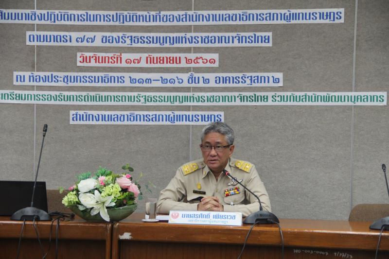 เลขาธิการสภาผู้แทนราษฎร เป็นประธานเปิดโครงการสัมมนาเชิงปฏิบัติการในการปฏิบัติหน้าที่ของสำนักงานเลขาธิการสภาผู้แทนราษฎร ตามมาตรา ๗๗ ของรัฐธรรมนูญแห่งราชอาณาจักรไทย