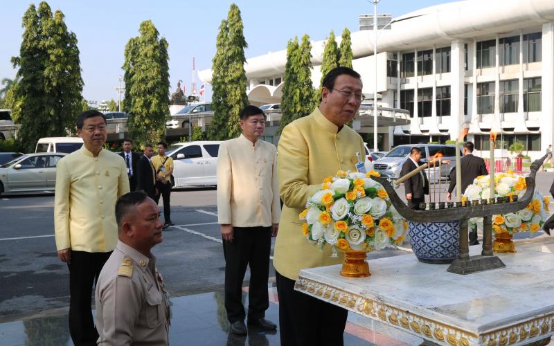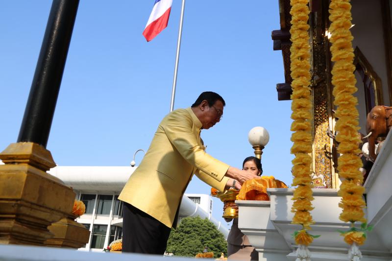 ในการนี้ ประธานสภานิติบัญญัติแห่งชาติ ได้จุดธูปเทียนบูชาพระสยามเทวาธิราช พระเสื้อเมือง
