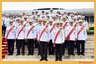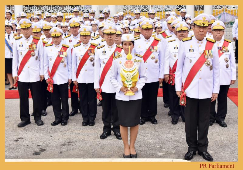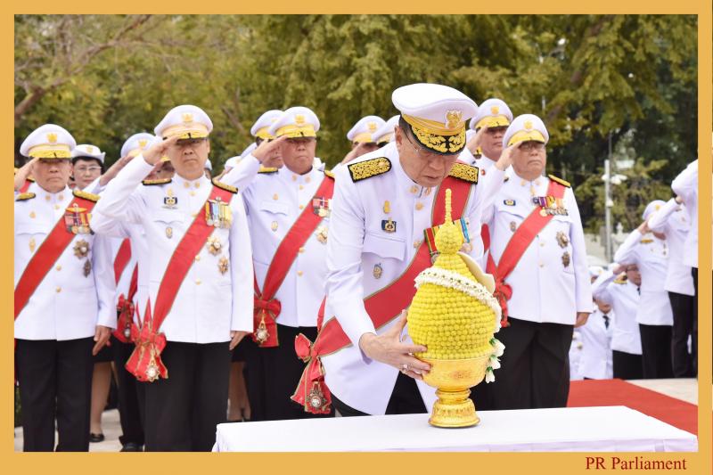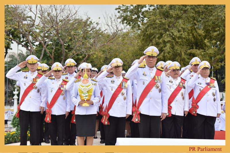 คนที่หนึ่ง และสมาชิกสภานิติบัญญัติแห่งชาติ นำพานประดับพุ่มดอกไม้ถวายบังคมในนาม