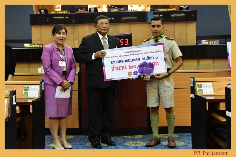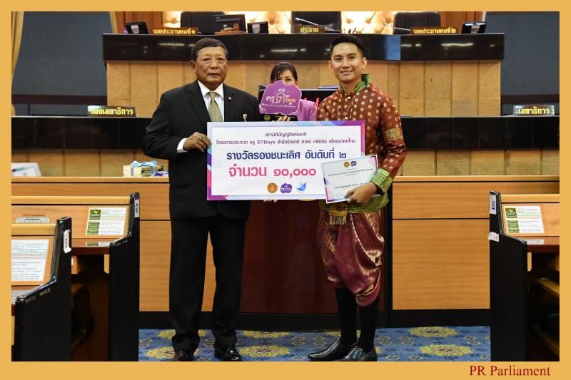 | วันอังคารที่ ๑๘ ธันวาคม ๒๕๖๑ เวลา ๐๙.๐๐ นาฬิกา ณ ห้องประชุมรัฐสภา ชั้น ๒ อาคารรัฐสภา ๑ นายสุรชัย เลี้ยงบุญเลิศชัย รองประธานสภานิติบัญญัติแห่งชาติ คนที่หนึ่ง เป็นประธานในพิธีตัดสินผลงาน รอบชิงชนะเลิศ และพิธีประกาศผลและมอบรางวัลครู D7Days สำนึกรักชาติ ศาสน์ กษัตริย์ เพื่ออนาคตไทย โดยมี พลอากาศเอก ชาลี จันทร์เรือง ประธานคณะกรรมาธิการวิสามัญการพิทักษ์และเทิดทูนสถาบัน พระมหากษัตริย์ กล่าวรายงาน โดยรองประธานสภานิติบัญญัติแห่งชาติ คนที่หนึ่ง กล่าวว่า สภานิติบัญญัติ แห่งชาติ ได้เล็งเห็นความสำคัญของการศึกษาจึงได้จัดโครงการที่เป็นการเสริมสร้างและเพิ่มการเรียนรู้ ให้แก่เด็กและเยาวชนทั้งในและนอกห้องเรียนมาโดยตลอดอาทิ โครงการสภาจำลองสัญจร โครงการผู้นำ นักประชาธิปไตยสำหรับเยาวชนด้วยกระบวนการลูกเสือ ซึ่งกิจกรรมดังกล่าวนอกจากจะเป็นกิจกรรมที่มีประโยชน์ ต่อเด็กและเยาวชนแล้ว ยังเป็นประโยชน์ต่อประเทศชาติโดยรวม เช่นเดียวกับโครงการในวันนี้ ที่เป็นการประกวด แข่งขัน เพื่อเสริมสร้างครู อาจารย์ และบุคลากรทางการศึกษาผู้ที่สอนวิชาประวัติศาสตร์ให้ได้นำความรู้หรือเทคนิค การศึกษาประวัติศาสตร์เชิงสร้างสรรค์ในการถ่ายทอดความรู้เกี่ยวกับเรื่องของสถาบันพระมหากษัตริย์ให้กับ นักเรียนเพื่อให้มีจิตสำนึกรักและห่วงแหน มุ่งจงรักภักดี พร้อมธำรงรักษาไว้ซึ่งสถาบันชาติ ศาสนา พระมหากษัตริย์ ซึ่งเป็นสถาบันหลักของชาติ ทั้งนี้ สภานิติบัญญัติแห่งชาติ หวังว่าการจัดโครงการประกวดครู D7Days สำนึกรักชาติ ศาสน์ กษัตริย์ เพื่ออนาคตไทยนี้จะเป็นจุดเริ่มต้นสำหรับการเสริมสร้างครู อาจารย์ บุคลากรทางการศึกษาผู้ที่สอน วิชาประวัติศาสตร์ ในการถ่ายทอดความรู้ให้แก่เด็กเยาวชนคนรุ่นใหม่เพื่อร่วมกันสืบทอดความรักชาติในโรงเรียน สถาบันการศึกษาและสังคมต่อไป จากนั้น รองประธานสภานิติบัญญัติแห่งชาติ คนที่หนึ่ง ได้มอบเกียรติบัตรให้กับพรีเซ็นเตอร์โครงการ ประกอบด้วย พลตรี วรวุฒิ แสงทอง และนางสาวณัชชา เตชะหรูวิจิตร พร้อมมอบเกียรติบัตรให้กับผู้สนับสนุน โครงการ จำนวน ๒ คน ประกอบด้วย นายมานพ แย้มอุทัย ผู้ทรงคุณวุฒิ สำนักงานกองทุนสนับสนุน การสร้างเสริมสุขภาพ สสส. และนางวรินรำไพ ปุณย์ธนารีย์ รองผู้จัดการกองทุนพัฒนาสื่อปลอดภัยและสร้างสรรค์ จากนั้น รองประธานสภานิติบัญญัติแห่งชาติ คนที่หนึ่ง ได้มอบของที่ระลึกแก่คณะกรรมการผู้ทรงคุณวุฒิ ที่ตัดสินรอบชิงชนะเลิศ ได้แก่ ๑. นางสาวจินตนันท์ ชญาต์ร ศุภมิตร สมาชิกสภานิติบัญญัติแห่งชาติ และโฆษกค