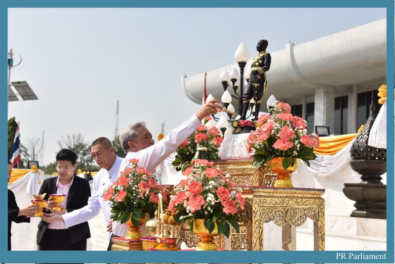 รัชกาลที่ ๗ เลขาธิการสภาผู้แทนราษฎร หลั่งนำสังข์ และเจิมพระบาทรูปหล่อ จำลองรัชกาลที่ ๕