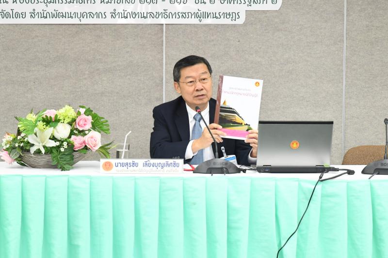 เกี่ยวกับนักกฎหมายนิติบัญญัติของส่วนราชการสังกัดรัฐสภา พร้อมบรรยายหัวข้อ หลักการ แนวคิด และเจตนารมณ์เกี่ยวกับนักกฎหมาย นิติบัญญัติ และหัวข้อ ระเบียบ ก.ร. ว่าด้วยการกำหนดตำแหน่งนักกฎหมาย นิติบัญญัติ โดยมี นายสรศักดิ์ เพียรเวช เลขาธิการสภาผู้แทนราษฎรกล่าวรายงาน