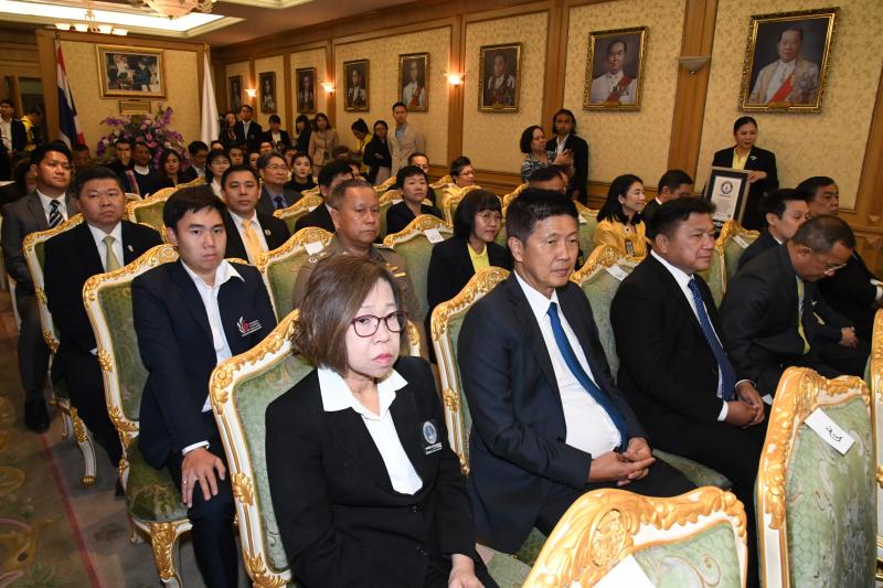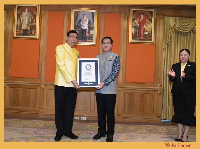 จากนั้น ประธานสภานิติบัญญัติแห่งชาติรับมอบ ตราสัญลักษณ์ GUINESS WORLD RECORDS จาก นายยุทธศักดิ์ สุภสร ผู้ว่าการการท่องเที่ยวแห่งประเทศไทย พร้อมทั้งมอบเงินจากการจัดโครงการให้แก่ นายทวีศักดิ์ วาณิชย์เจริญ รองปลัดกระทรวงการท่องเที่ยวและกีฬา เพื่อนำเข้าสมทบกองทุน ช่วยเหลือเยียวยานักท่องเที่ยวต่างชาติ กระทรวงการท่องเที่ยวและกีฬา ในโอกาสนี้ได้มอบใบประกาศเกียรติคุณเพื่อแสดงความขอบคุณ ผู้ให้การสนับสนุน การจัดโครงการดังกล่าว จำนวน ๕๕ ราย