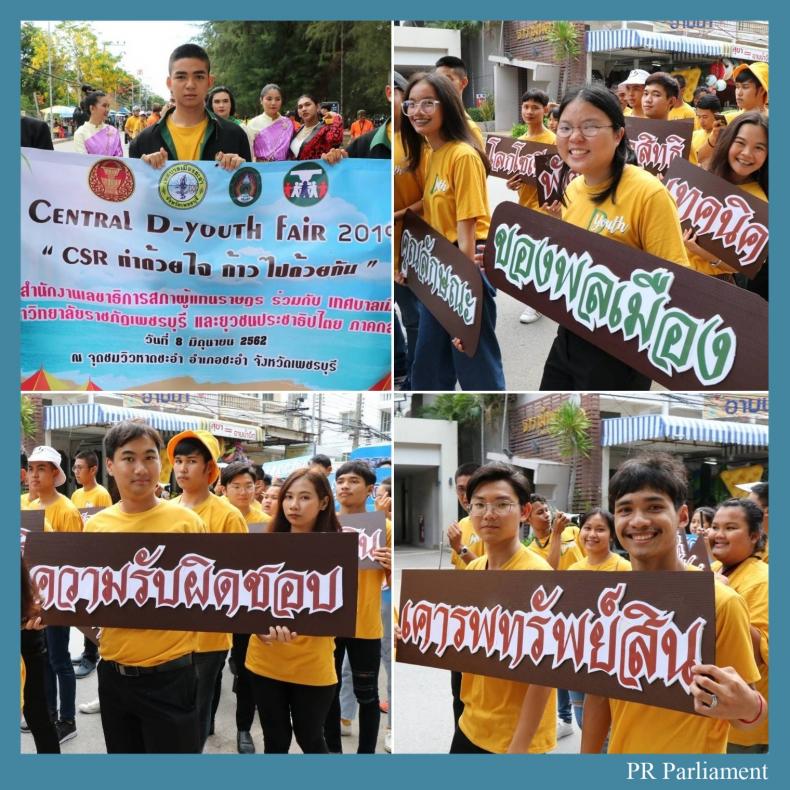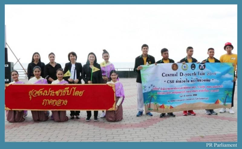 เมื่อวันเสาร์ที่ ๘ มิถุนายน ๒๕๖๒ เวลา ๑๓.๐๐ นาฬิกา ณ โรงแรม ลองบีช ชะอำ จังหวัดเพชรบุรี นางจงเดือน สุทธิรัตน์ ผู้อำนวยการสำนักประชาสัมพันธ์ นำยุวชนประชาธิปไตย ภาคกลาง ร่วมบริจาคโลหิต เพื่อเฉลิมพระเกียรติพระบาทสมเด็จพระเจ้าอยู่หัว และถวายเป็นพระราชกุศล ซึ่งเป็นกิจกรรมหนึ่งในกิจกรรม รวมรุ่นยุวชนเพื่อการสร้างความเป็นพลเมือง ประจำปี ๒๕๖๒ โดยมีเจ้าหน้าที่จากสถานีหัวหินเฉลิมพระเกียรติ สภากาชาดไทย มาอำนวยความสะดวกในกิจกรรมบำเพ็ญสาธารณประโยชน์ ซึ่งยุวชนประชาธิปไตย ได้ปั่น จักรยานเส้นทางถนนเลียบชายหาดชะอำ เพื่อประชาสัมพันธ์เชิญชวนนักท่องเที่ยวและประชาชนให้มาร่วม บริจาคโลหิตด้วย นอกจากนี้ ยุวชนประชาธิปไตยได้สอนผู้เข้าร่วมกิจกรรมทำกระเป๋าจากไวนิล โดยนำของ เหลือใช้มาทำเป็นกระเป๋าให้เกิดประโยชน์เพื่อลดการใช้ถุงพลาสติก จากนั้น เวลา ๑๖.๐๐ - ๑๖.๓๐ นาฬิกา ณ จุดชมวิวหาดชะอำ จังหวัดเพชรบุรี นางจงเดือน สุทธิรัตน์ ผู้อำนวยการสำนักประชาสัมพันธ์ นำบุคลากรของสำนักประชาสัมพันธ์ และยุวชนประชาธิปไตย เคลื่อนขบวน พาเหรดเพื่อประชาสัมพันธ์ให้ความรู้เกี่ยวกับความเป็นพลเมืองในระบอบประชาธิปไตย และเชิญชวนเข้าร่วม กิจกรรมการบำเพ็ญประโยชน์เพื่อสังคม Central D - youth fair 2019 "CSR ทำด้วยใจ ก้าวไปด้วยกัน" โดยได้จัดซุ้มทำขนมและซุ้มทำกระเป๋าจากไวนิลด้วย