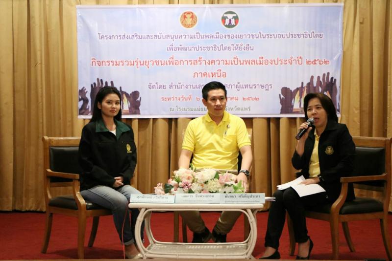 | วันเสาร์ที่ ๖ กรกฎาคม ๒๕๖๒ เวลา ๑๓.๐๐ นาฬิกา ณ โรงแรมแม่ยมพาเลส จังหวัดแพร่ มีการเสวนา เรื่อง ยุวชนประชาธิปไตยกับการสนับสนุนภารกิจของฝ่ายนิติบัญญัติ โดย นายเอกการ ซื่อทรงธรรม สมาชิกสภาผู้แทนราษฎรจังหวัดแพร่ พรรคอนาคตใหม่ และ น.ส.ศุภลักษณ์ ถวิลวิชาติ ที่ปรึกษาคณะกรรมการยุวชนประชาธิปไตยภาคเหนือ ประจำปี ๒๕๖๒ โดยมี น.ส.มันทนา ศรีเพ็ญประภา ผู้บังคับบัญชากลุ่มงานเผยแพร่ประชาธิปไตยและกิจกรรม สภาผู้แทนราษฎร เป็นผู้ดำเนินรายการ ซึ่งประเด็นสำคัญในการเสวนาคือ การขับเคลื่อนความเป็น พลเมืองในบทบาทของสมาชิกสภาผู้แทนราษฎรและเยาวชนเพื่อสร้างสังคมให้เข้มแข็ง ซึ่ง นายเอกการ ซื่อทรงธรรม สมาชิกสภาผู้แทนราษฎรจังหวัดแพร่ พรรคอนาคตใหม่ ได้ขอให้ เยาวชนตระหนักถึงความสำคัญของการขับเคลื่อนความเป็นพลเมืองด้วยการวางเป้าหมาย ที่ชัดเจนและลงมือปฏิบัติจริง พร้อมกับวัดผลการปฏิบัติดังกล่าวให้เกิดผลอย่างเป็นรูปธรรม ทั้งนี้ ภายหลังจากเสร็จสิ้นการเสวนา รองเลขาธิการสภาผู้แทนราษฎร ได้มอบของที่ระลึก แก่ผู้ร่วมเสวนาเพื่อแสดงความขอบคุณ