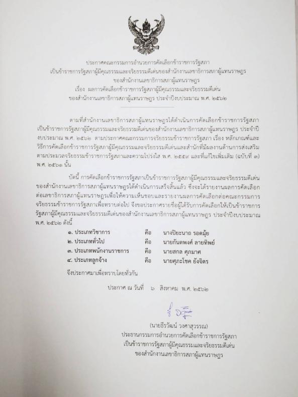 ซึ่งผู้ที่ได้รับเลือกเป็นข้าราชการรัฐสภาผู้มีคุณธรรมและจริยธรรมดีเด่นของสำนักงาน