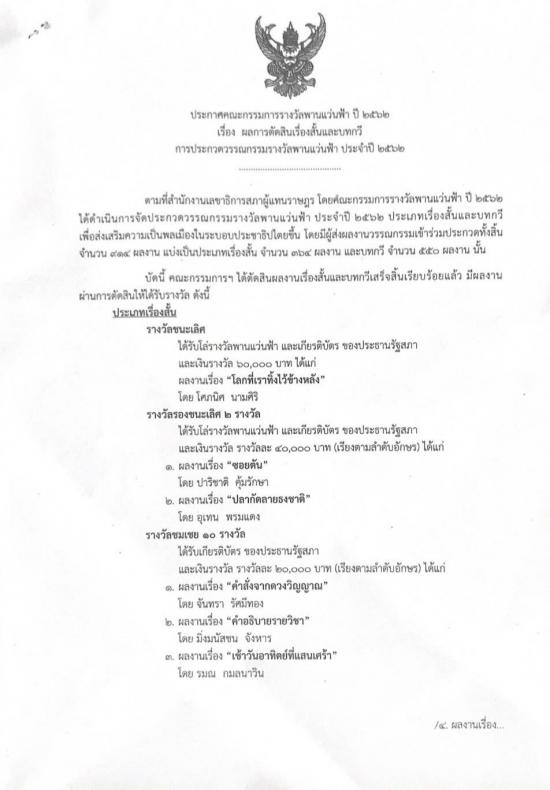 ผลการตัดสินเรื่องสั้นและบทกวีการประกวดวรรณกรรมรางวัลพานแว่นฟ้า ประจำปี  ๒๕๖๒