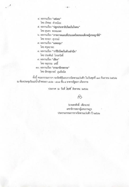 ทั้งนี้ คณะกรรมการฯ จะจัดพิธีมอบรางวัลพานแว่นฟ้า ในวันพุธที่ ๑๘ กันยายน ๒๕๖๒