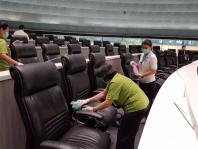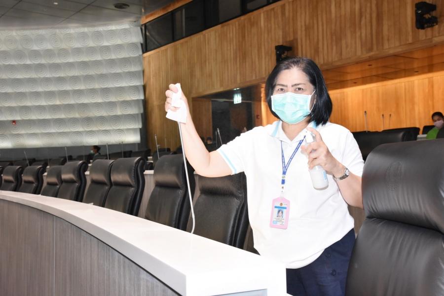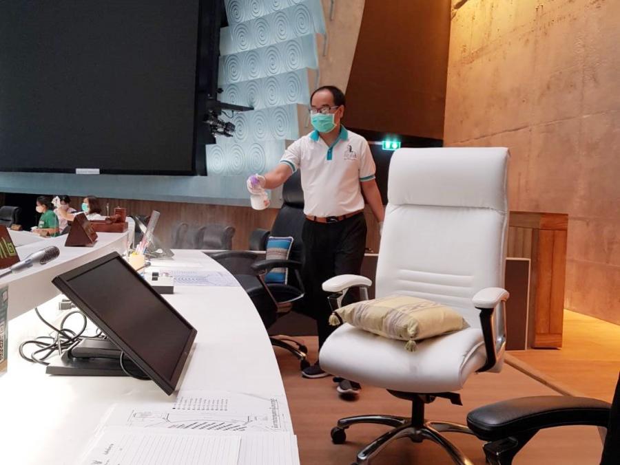 ที่นั่งสมาชิก และใช้กระดาษที่ผสมน้ำยาฆ่าเชื้อเช็ดบริเวณปลายไมโครโฟนทุกตัว เมื่อ