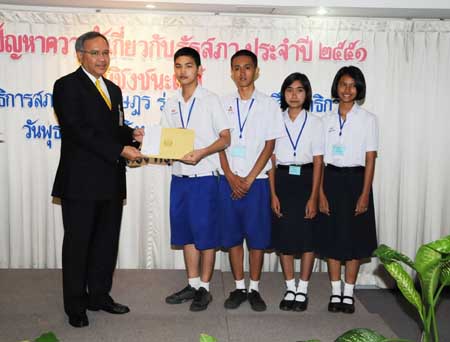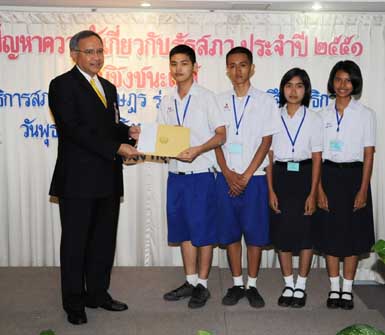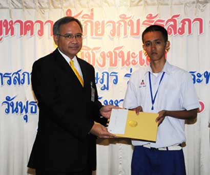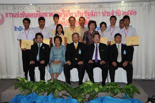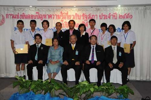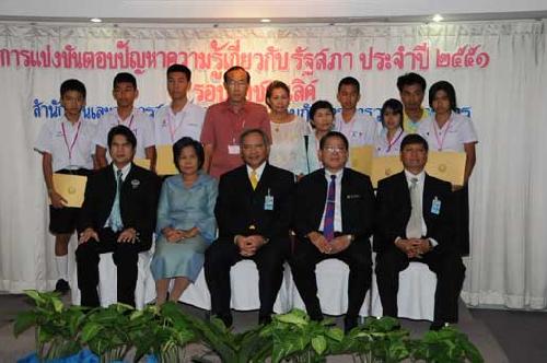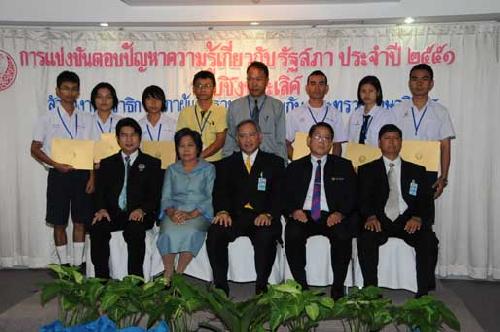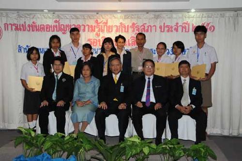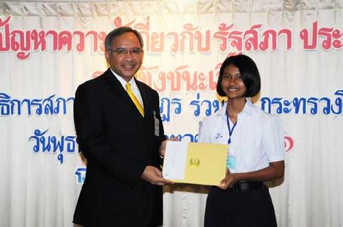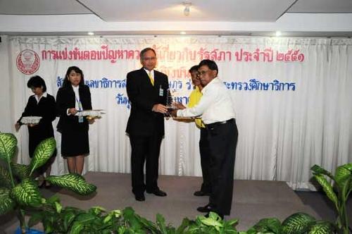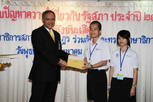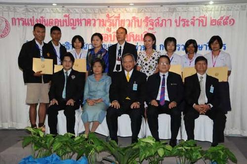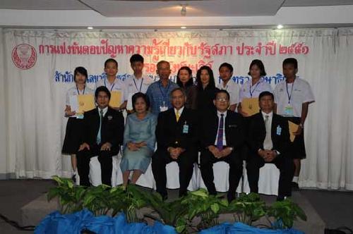 | นายพิทูร พุ่มหิรัญ เลขาธิการสภาผู้แทนราษฎร เป็นประธานในพิธีมอบโล่รางวัล พร้อมเกียรติบัตร และทุนการศึกษาแก่นักเรียนที่ชนะเลิศ รองชนะเลิศ และรางวัลชมเชย การแข่งขันตอบปัญหาความรู้เกี่ยวกับรัฐสภา ประจำปี ๒๕๕๑ ซึ่งโรงเรียนที่ชนะเลิศมี ๒โรงเรียน ได้แก่ โรงเรียนสารสิทธิ์พิทยาลัย จังหวัดราชบุรี และโรงเรียนฉวางรัชดาภิเษก จังหวัดนครศรีธรรมราช เมื่อวันพุธที่ ๒๗ สิงหาคม ๒๕๕๑ เวลา ๐๙.๐๐ นาฬิกา ณ โรงแรมตรัง ถนนวิสุทธิกษัตริย์ กรุงเทพฯ |