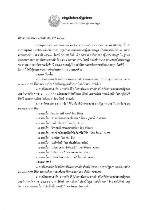 เลขาธิการสภาผู้แทนราษฎร ในฐานะประธานกรรมการรางวัลพานแว่นฟ้า ปี ๒๕๖๓