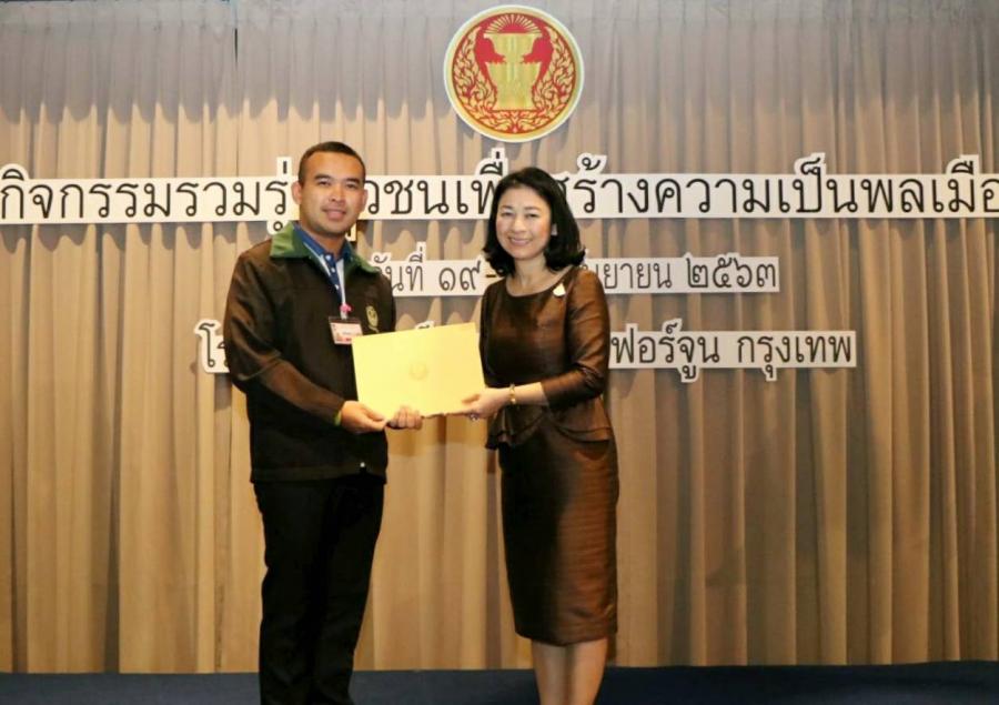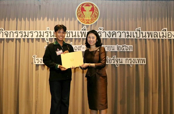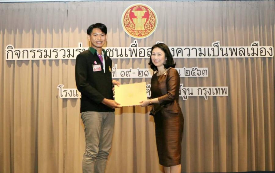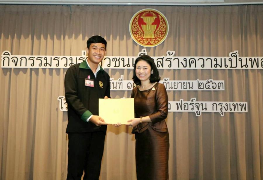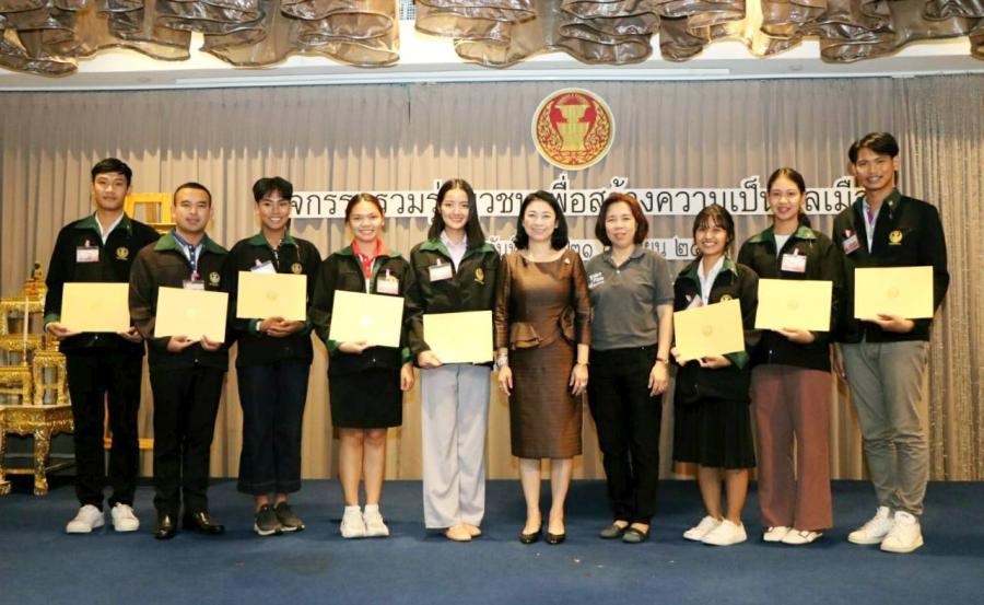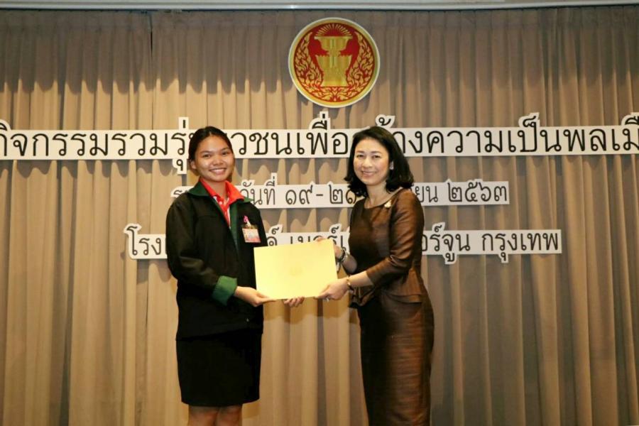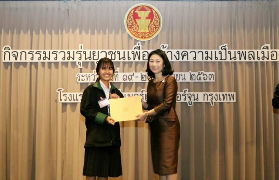 ผู้อำนวยการสำนักประชาสัมพันธ์ ได้มอบโล่รางวัล พร้อมเกียรติบัตรให้แก่ยุวชนประชาธิปไตยที่จัดทำคลิปวิดีโอเกี่ยวกับการเป็นพลเมืองดีในสถานการณ์ปัจจุบัน