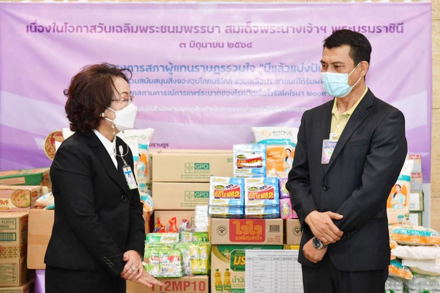 วันพฤหัสบดีที่ 17 มิถุนายน 2564 เวลา 12.10 นาฬิกา ณ บริเวณห้องโถง ชั้น 1 อาคารรัฐสภา นางพรพิศ เพชรเจริญ เลขาธิการสภาผู้แทนราษฎร รับมอบสิ่งของเครื่องอุปโภคบริโภคจาก นายสมชาย ชาญสมาธิ Project Director บริษัท แอ๊ดวานซ์ อินฟอร์เมชั่นเทคโนโลยี จำกัด และน.ส.สิตาวีร์ ธีรวิรุฬห์ ผู้อำนวยการสำนักสารสนเทศ เพื่อร่วมสนับสนุนโครงการสภาผู้แทนราษฎรรวมใจ "มีแล้วแบ่งปัน" เนื่องในโอกาสวันเฉลิมพระชนมพรรษา สมเด็จพระนางเจ้าฯ พระบรมราชินี 3 มิถุนายน 2564 เพื่อช่วยเหลือประชาชนที่ได้รับผลกระทบและความเดือดร้อนจากสถานการณ์การแพร่ระบาดของโรคติดเชื้อไวรัสโคโรนา 2019 (โควิด-19) โดยจะส่งมอบให้แก่สำนักงานเขตดุสิต เพื่อดำเนินการแจกจ่ายให้แก่ประชาชนในพื้นที่ที่ได้รับผลกระทบต่อไป