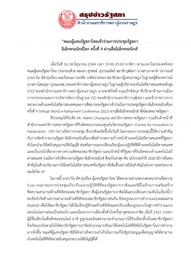 เมื่อวันที่ 16-18 มิถุนายน 25664 เวลา 19.00 - 23.00 นาฬิกา (ตามเวลาในประเทศไทย) คณะผู้แทนรัฐสภาไทย ประกอบด้วย พลเอก สุรพงษ์  สุวรรณอัตถ์ สมาชิกวุฒิสภา นางสาวภาดาท์  วรกานนท์ นายวาโย  อัศวรุ่งเรือง และร้อยเอก จองชัย  วงศ์ทรายทอง สมาชิกสภาผู้แทนราษฎร ในฐานะผู้สังเกตการณ์ นางสาวโสมอุษา  บูรณะเหตุ รองเลขาธิการสภาผู้แทนราษฎร ในฐานะผู้บริหารเทคโนโลยีสารสนเทศระดับสูง (CIO) ของสำนักงานเลขาธิการสภาผู้แทนราษฎร นายพงศ์กิตติ์  อรุณภักดีสกุล ที่ปรึกษาด้านการเมืองการปกครองและการบริหารจัดการ ในฐานะ CIO ของสำนักงานเลขาธิการวุฒิสภา และข้าราชการจากหน่วยงานด้านเทคโนโลยีสารสนเทศและการสื่อสารของรัฐสภาเข้าร่วมในการประชุมรัฐสภาอิเล็กทรอนิกส์โลก ครั้งที่ 9 (Virtual World e-Parliament Conference 2021) ผ่านสื่ออิเล็กทรอนิกส์ จัดโดยสหภาพรัฐสภา