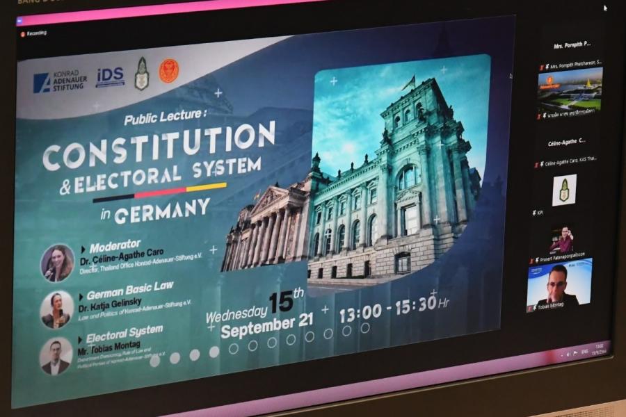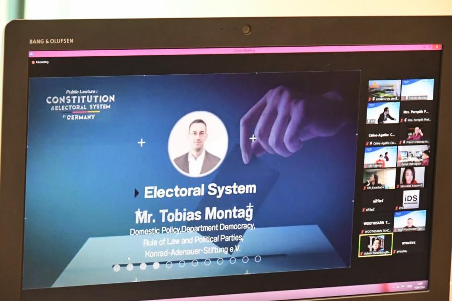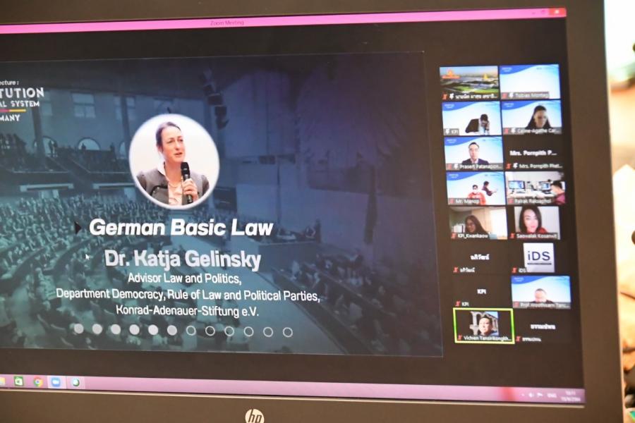 โดยการจัดงานสัมมนาในครั้งนี้ จึงมีวัตถุประสงค์เพื่อให้ท่านได้เรียนรู้ในเรื่องของรัฐธรรมนูญและกระบวนการเลือกตั้งของประเทศเยอรมนี เยอรมนีเป็นประเทศที่มีการพัฒนาประชาธิปไตยผ่านการออกแบบรัฐธรรมนูญและระบบการเลือกตั้งที่มีความน่าสนใจเป็นอย่างมาก เนื่องจากเป็นประเทศที่มีประสบการณ์ผ่านความขัดแย้งทางการเมือง และวิกฤตเศรษฐกิจครั้งใหญ่ ก่อนที่จะพัฒนามาเป็นประเทศเยอรมนีที่มีความเข้มแข็งด้านประชาธิปไตยเช่นทุกวันนี้ ดังนั้น การจัดงานสัมมนาในวันนี้จึงเป็นเวทีสำคัญ ที่ทุกท่านจะได้มีโอกาสรับฟังการถ่ายทอดความรู้และประสบการณ์จากผู้เชี่ยวชาญในเรื่องการออกแบบรัฐธรรมนูญและระบบการเลือกตั้ง และร่วมแลกเปลี่ยนความคิดเห็นในเวทีสัมมนาสาธารณะในรูปแบบออนไลน์ผ่านแอปพลิเคชัน Zoom เนื่องจากสถานการณ์การแพร่ระบาดของเชื้อไวรัสโคโรนา 2019 ยังคงแพร่ระบาดในประเทศไทยอย่างไรก็ตาม ต้องขอขอบพระคุณ ดร. กัตยา  เคลินสกี้ ผู้เชี่ยวชาญด้านกฎหมายและการเมือง ที่ปรึกษาของ อาเดเนา-ชติฟตุง และ ดร. ซาบีเนอ โพคอนยี นักวิจัยด้านการเลือกตั้งและสังคม ฝ่ายวิเคราะห์และให้คำปรึกษาของอาเดเนา-ชติฟตุง ผู้เป็นวิทยากรในวันนี้ นอกจากนี้ ขอขอบพระคุณผู้บริหารและบุคลากรจากสถาบันพระปกเกล้า สำนักงานเลขาธิการวุฒิสภา Konrad-Adenauer-Stiftung (KAS) และสถาบันศึกษาพัฒนาประชาธิปไตย (Institude of Democratization Studies: IDS) ซึ่งเป็นหน่วยงานเครือข่ายความร่วมมือทางวิชาการเพื่อสนับสนุนงานนิติบัญญัติ ที่เห็นความสำคัญของการร่วมมือจัดกิจกรรมดี ๆ ในครั้งนี้ ดิฉันเอง  มีความยินดีและคาดหวังว่าทั้ง 5 หน่วยงานเครือข่ายนี้จะสามารถบูรณาการและรังสรรค์กิจกรรมดี ๆ เพื่อสนับสนุนงานทางนิติบัญญัติต่อไปในอนาคตข้างหน้านี้อีกด้วย”