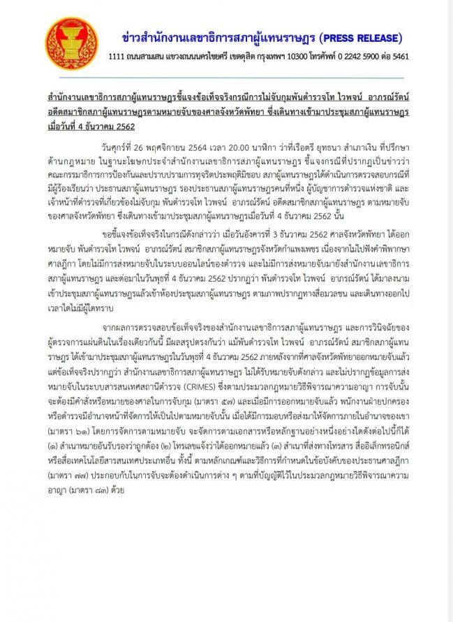 โฆษกประจำสำนักงานเลขาธิการสภาผู้แทนราษฎร ชี้แจงข้อเท็จจริงกรณีการไม่จับกุม พ.ต.ท.ไวพจน์ อาภรณ์รัตน์ อดีต ส.ส. ตามหมายจับของศาลจังหวัดพัทยา