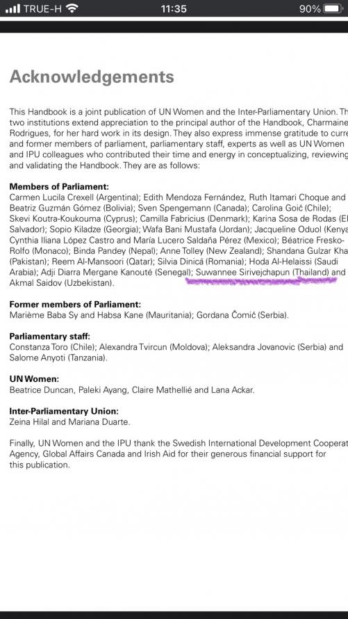 การจัดทำเอกสารชุดนี้ นางสุวรรณี สิริเวชชะพันธ์ สมาชิกวุฒิสภา ซึ่งดำรงตำแหน่งกรรมาธิการในคณะกรรมาธิการสหภาพรัฐสภาสตรี (Bureau of Women Parliamentarians)ในช่วงปี พ.ศ. 2559-2564) ได้มีส่วนร่วมจัดทำและให้ข้อมูลด้านกฎหมายของประเทศไทยให้แก่สหภาพรัฐสภา (Inter-Parliamentary Union: IPU) และ UN Women