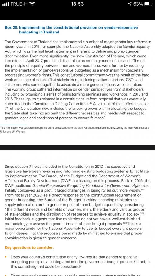 ทั้งนี้ ในหัวข้อเรื่องการบัญญัติกฎหมายงบประมาณที่คำนึงถึงมิติหญิง-ชาย คู่มือฯ ได้ยกตัวอย่างการกำหนดด้านงบประมาณที่คำนึงถึงมิติหญิง-ชายของประเทศไทยที่ถือว่าเป็นตัวอย่างที่ดี โดยอ้างถึงบทบัญญัติรัฐธรรมนูญแห่งราชอาณาจักรไทย พ.ศ. 2560 มาตรา 71 วรรคสี่ที่บัญญัติว่า “ในการจัดสรรงบประมาณ รัฐพึงคํานึงถึงความจําเป็นและความต้องการที่แตกต่างกันของเพศ วัย และสภาพของบุคคล ทั้งนี้ เพื่อความเป็นธรรม” และพระราชบัญญัติความเท่าเทียมระหว่างเพศ พ.ศ. 2558 ที่กำหนดนิยามและห้ามมิให้มีการเลือกปฏิบัติโดยไม่เป็นธรรมระหว่างเพศ
