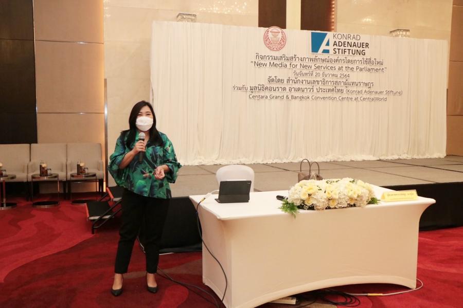 วันจันทร์ที่ 20 ธันวาคม 2564 เวลา 13.00 - 15.00 นาฬิกา ณ World Ballroom B - C ชั้น 23 โรงแรมเซ็นทาราแกรนด์ และบางกอก คอนเวนชัน เซ็นเตอร์ แอท เซ็นทรัลเวิลด์ กรุงเทพฯ ในช่วงบ่ายของการสัมมนาโครงการเสริมสร้างภาพลักษณ์องค์กรโดยการใช้สื่อใหม่ (New Media)เป็นการบรรยายในหัวข้อ “สื่อใหม่กับการประชาสัมพันธ์งานนิติบัญญัติ” โดย ผศ.ณัฐา ฉางชูโต รองคณบดีคณะนิเทศศาสตร์ มหาวิทยาลัยกรุงเทพ และหัวหน้าหลักสูตรการผลิตอีเวนต์และการจัดการนิทรรศการและการประชุม ในการนี้ นางจงเดือน สุทธิรัตน์ ที่ปรึกษาด้านระบบงานนิติบัญญัติ กล่าวขอบคุณ และมอบของที่ระลึกให้กับวิทยากร