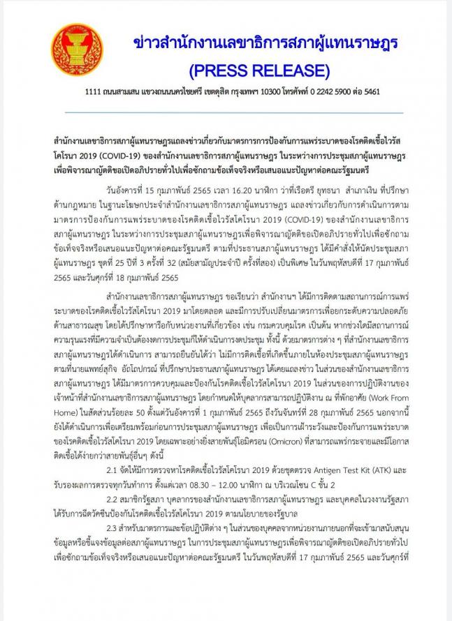 วันอังคารที่ 15 กุมภาพันธ์ 2565 เวลา 16.20 นาฬิกา ณ อาคารรัฐสภา ว่าที่เรือตรี ยุทธนา สำเภาเงิน ที่ปรึกษาด้านกฎหมาย ในฐานะโฆษกประจำสำนักงานเลขาธิการสภาผู้แทนราษฎร แถลงข่าวเกี่ยวกับมาตรการการป้องกันการแพร่ระบาดของโรคติดเชื้อไวรัสโคโรนา 2019 (COVID-19) ของสำนักงานเลขาธิการสภาผู้แทนราษฎร ในระหว่างการประชุมสภาผู้แทนราษฎรเพื่อพิจารณาญัตติขอเปิดอภิปรายทั่วไป เพื่อซักถามข้อเท็จจริงหรือข้อเสนอแนะปัญหาต่อคณะรัฐมนตรี