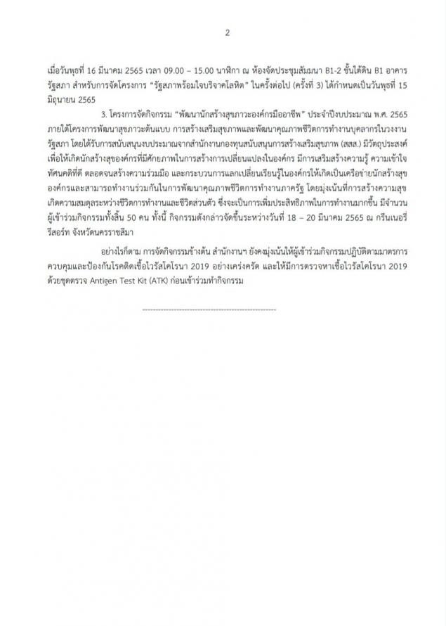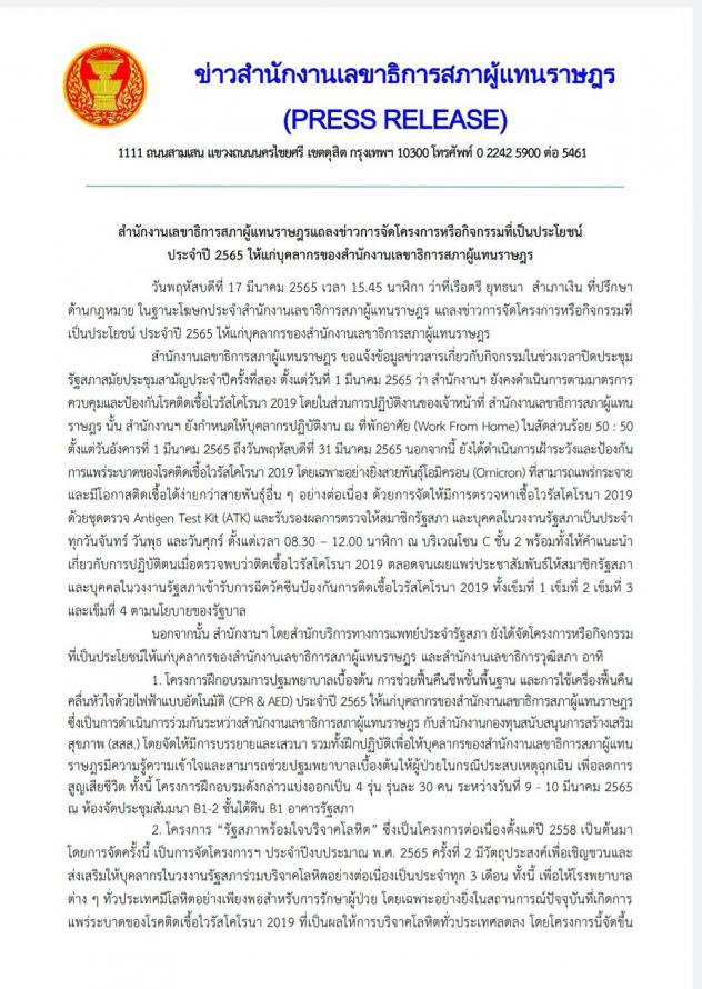 วันพฤหัสบดีที่ 17 มีนาคม 2565 เวลา 16.00 นาฬิกา ณ อาคารรัฐสภา ว่าที่เรือตรี ยุทธนา สำเภาเงิน ที่ปรึกษาด้านกฎหมาย ในฐานะโฆษกประจำสำนักงานเลขาธิการสภาผู้แทนราษฎร แถลงข่าวเกี่ยวกับการจัดโครงการหรือกิจกรรมที่เป็นประโยชน์ประจำปี 2565 ให้แก่บุคลากรของสำนักงานเลขาธิการสภาผู้แทนราษฎร ในช่วงเวลาปิดประชุมรัฐสภาสมัยประชุมสามัญประจำปีครั้งที่สอง ตั้งแต่วันที่ 1 มี.ค. 65 โดยสำนักงานฯ ยังคงดำเนินการตามมาตรการควบคุมและป้องกันโรคติดเชื้อไวรัสโคโรนา 2019 และกำหนดให้บุคลากรปฏิบัติงาน ณ ที่พักอาศัย (Work From Home) ในสัดส่วน 50 : 50 อีกทั้งยังมีการเฝ้าระวังและป้องกันการแพร่ระบาด ของโรคติดเชื้อไวรัสโคโรนา 2019 โดยการจัดให้มีการตรวจหาเชื้อด้วยชุดตรวจ  ATK ทุกวันจันทร์ พุธ และศุกร์ เวลา 08.30 น. - 12.00 น. ณ บริเวณโซน C ชั้น 2 อาคารรัฐสภา นอกจากนี้ สำนักงานฯ โดยสำนักบริการทางการแพทย์ประจำรัฐสภา ยังได้จัดโครงการหรือกิจกรรมที่เป็นประโยชน์แก่บุคลากร อาทิ โครงการฝึกอบรมการปฐมพยาบาลเบื้องต้น การช่วยฟื้นคืนชีพขั้นพื้นฐาน และการใช้เครื่องฟื้นคืนคลื่นหัวใจด้วยไฟฟ้าแบบอัตโนมัติ (CPR & AED) ประจำปี 2565 โครงการรัฐสภาพร้อมใจบริจาคโลหิต และกิจกรรมพัฒนานักสร้างสุขภาวะองค์กรมืออาชีพ ประจำปีงบประมาณ พ.ศ. 2565 ซึ่งการจัดกิจกรรมข้างต้น สำนักงานฯ ยังคงมุ่งเน้นให้ผู้เข้าร่วมกิจกรรมปฏิบัติตามมาตรการควบคุมและป้องกันโรคติดเชื้อไวรัสโคโรนา 2019 อย่างเคร่งครัด และให้มีการตรวจหาเชื้อด้วยชุดตรวจ ATK ก่อนเข้าร่วมกิจกรรม (รายละเอียดตามเอกสารที่แนบ)
