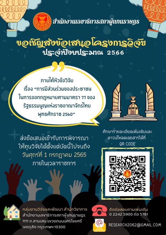 สำนักงานเลขาธิการสภาผู้แทนราษฎร ขอเชิญส่งข้อเสนอโครงการวิจัยประจำปีงบประมาณ 2566 ภายใต้หัวข้อเรื่อง การมีส่วนร่วมของประชาชนในการออกกฎหมายตามมาตรา 77 ของรัฐธรรมนูญแห่งราชอาณาจักรไทย พุทธศักราช 2560 สามารถส่งข้อเสนอเข้ารับการพิจารณาได้ตั้งแต่บัดนี้จนถึงวันที่ 1 ก.ค. 65 ภายในเวลาราชการ