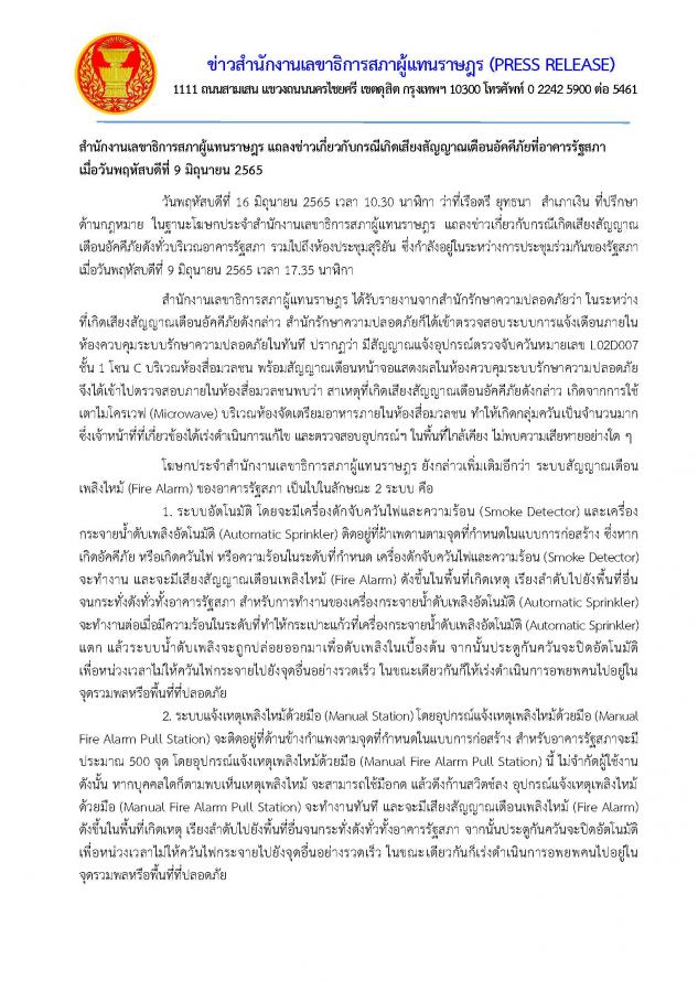 วันพฤหัสบดีที่ 16 มิถุนายน 2565 เวลา 10.30 นาฬิกา ณ อาคารรัฐสภา ว่าที่เรือตรี ยุทธนา สำเภาเงิน ที่ปรึกษาด้านกฎหมาย ในฐานะโฆษกประจำสำนักงานเลขาธิการสภาผู้แทนราษฎร แถลงข่าวเกี่ยวกับกรณีเกิดเสียงสัญญาณเตือนอัคคีภัยดังทั่วบริเวณอาคารรัฐสภา รวมไปถึงห้องประชุมสุริยัน ซึ่งกำลังอยู่ในระหว่างการประชุมร่วมกันของรัฐสภา เมื่อวันพฤหัสบดีที่ 9 มิ.ย. 65 เวลา 17.35 น.