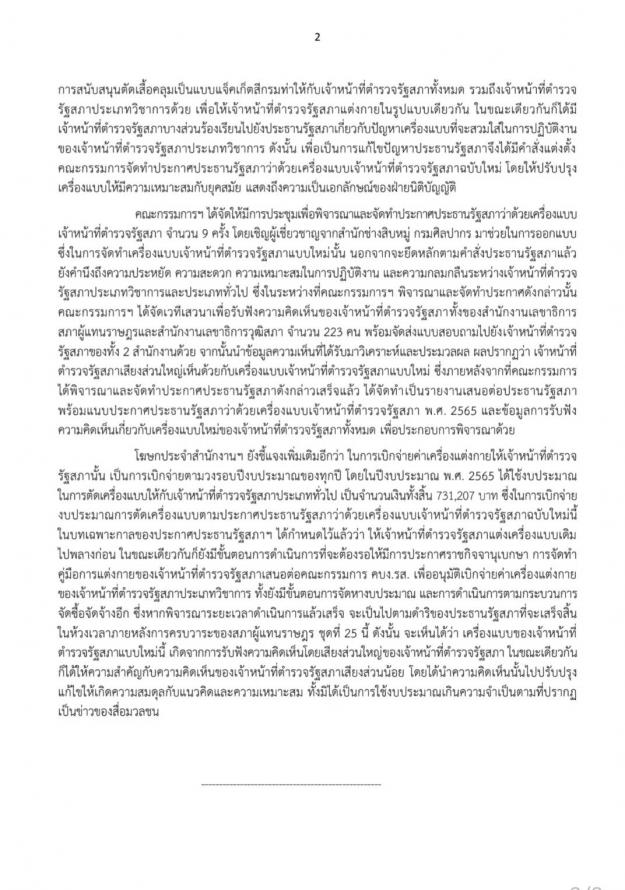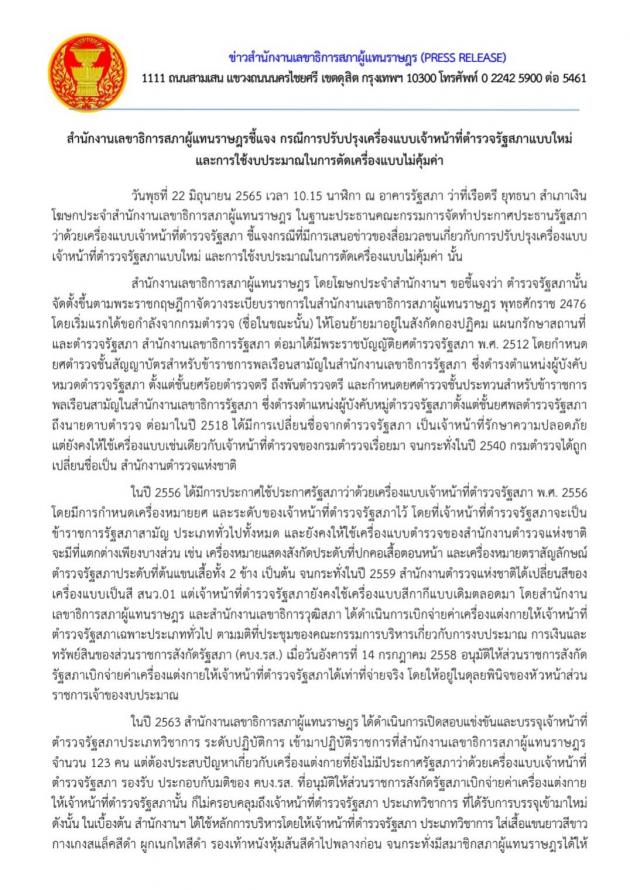 โฆษกประจำสำนักงานเลขาธิการสภาผู้แทนราษฎร ในฐานะประธานคณะกรรมการจัดทำประกาศประธานรัฐสภาว่าด้วยเครื่องแบบเจ้าหน้าที่ตำรวจรัฐสภา ชี้แจงกรณีที่มีการเสนอข่าวของสื่อมวลชนเกี่ยวกับการปรับปรุงเครื่องแบบเจ้าหน้าที่ตำรวจรัฐสภาแบบใหม่