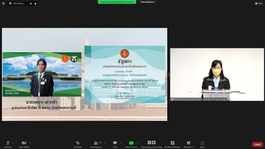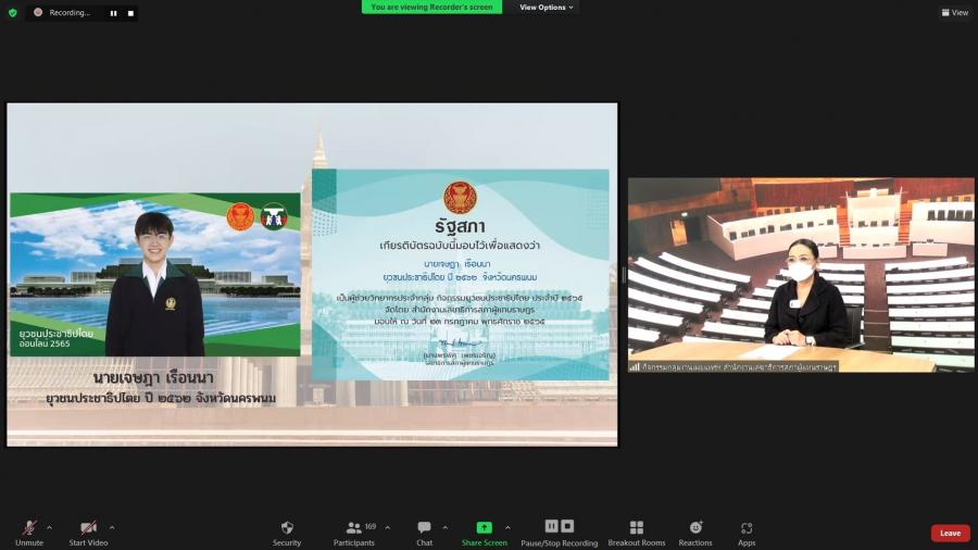 ในการนี้ น.ส.โสมอุษา  บูรณะเหตุ ได้มอบประกาศนียบัตรผ่านระบบออนไลน์ ให้แก่ผู้ผ่านการอบรมกิจกรรมยุวชนประชาธิปไตย ประจำปี 2565 รวมทั้งสิ้นจำนวน 156 คน และมอบประกาศนียบัตรให้แก่ยุวชนประชาธิปไตยรุ่นพี่ที่ได้เข้าร่วมเป็นวิทยากรกระบวนการกับสำนักงานฯ เพื่อเป็นขวัญและกำลังใจให้กับยุวชนฯ จำนวน 7 คน ได้แก่