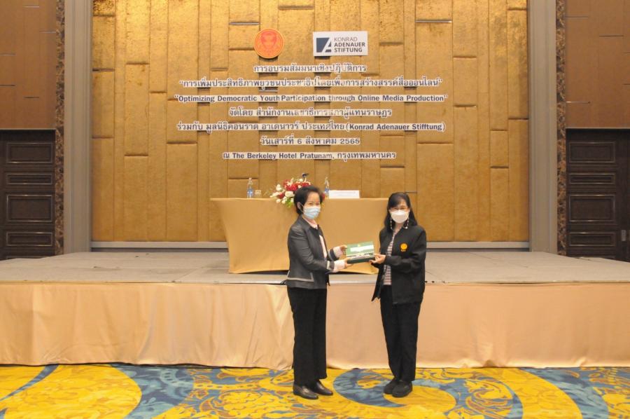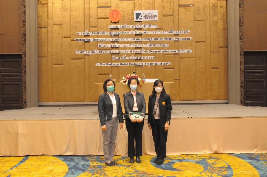 วันเสาร์ที่ 6 สิงหาคม 2565 เวลา 9.00 นาฬิกา ณ โรงแรม เดอะ เบอร์เคลีย์ ประตูน้ำ กรุงเทพฯ นางอัจฉรา จูยืนยง ผู้อำนวยการสำนักประชาสัมพันธ์ เป็นประธานในพิธีเปิดการอบรมสัมมนาเชิงปฏิบัติการ เรื่อง "การเพิ่มประสิทธิภาพยุวชนประชาธิปไตยเพื่อการสร้างสรรค์สื่อออนไลน์" จัดโดย สำนักงานเลขาธิการสภาผู้แทนราษฎร ร่วมกับ มูลนิธิคอนราดอาเดนาวร์ ประเทศไทย โดยมี นางนภาจรี จิวะนันทประวัติ ผู้แทนจากมูลนิธิคอนราดอาเดนาวร์  ได้กล่าวต้อนรับและพูดคุยกับยุวชนประชาธิปไตย จำนวน 60 คน