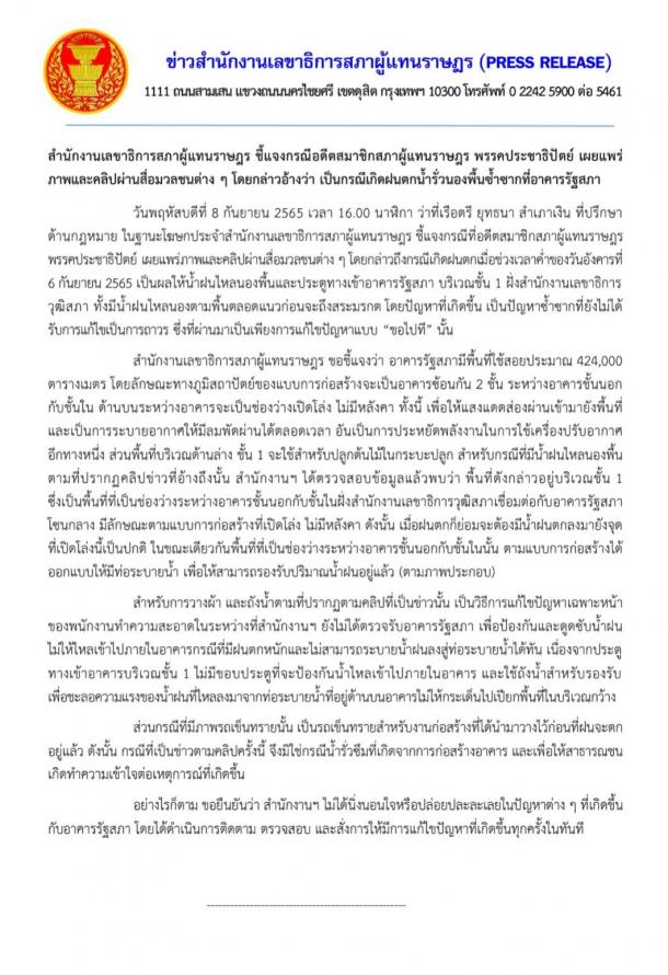 วันพฤหัสบดีที่ 8 กันยายน 2565 เวลา 16.00 นาฬิกา ว่าที่เรือตรี ยุทธนา สำเภาเงิน ที่ปรึกษาด้านกฎหมาย ในฐานะโฆษกประจำสำนักงานเลขาธิการสภาผู้แทนราษฎร ชี้แจงกรณีที่อดีตสมาชิกสภาผู้แทนราษฎร พรรคประชาธิปัตย์ เผยแพร่ภาพและคลิปผ่านสื่อมวลชนต่าง ๆ โดยกล่าวถึงกรณีเกิดฝนตกเมื่อช่วงเวลาค่ำของวันอังคารที่ 6 ก.ย. 65 เป็นผลให้น้ำฝนไหลนองพื้นและประตูทางเข้าอาคารรัฐสภา บริเวณชั้น 1 ฝั่งสำนักงานเลขาธิการวุฒิสภา และมีน้ำฝนไหลนองตามพื้นตลอดแนวก่อนจะถึงสระมรกต