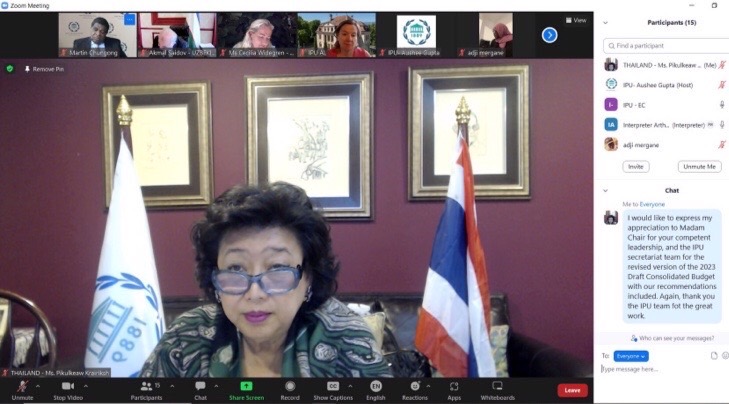 โดยที่ประชุมได้ร่วมกันพิจารณารับรองเอกสารทางการเงินที่สำคัญจำนวน 3 รายการ ดังนี้ 1. 2023 Draft consolidated budget 2. Financial situation of the IPU และ 3. Mobilization of voluntary funding