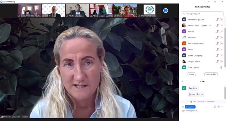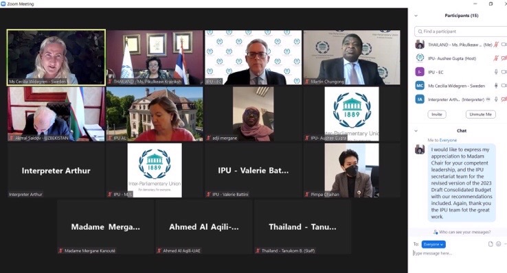 เมื่อวันจันทร์ที่ 3 ตุลาคม 2565 เวลา 19.00 20.00 นาฬิกา (ตามเวลาในประเทศไทย) นางพิกุลแก้ว ไกรฤกษ์ ประธานคณะกรรมาธิการการต่างประเทศ วุฒิสภา และกรรมการบริหารสหภาพรัฐสภา (Member of the IPU Executive Committee) ในฐานะอนุกรรมาธิการด้านการเงินของสหภาพรัฐสภา (Member of the IPU Sub-Committee on Finance: SCOF) ได้เข้าร่วมการประชุมคณะอนุกรรมาธิการด้านการเงิน ในรูปแบบผ่านสื่ออิเล็กทรอนิกส์ ผ่านระบบการประชุมทางไกล ZOOM ซึ่งมีผู้เข้าร่วมประชุมประกอบด้วยสมาชิกรัฐสภาจากสวีเดน อุซเบกิสถาน เซเนกัล ไทย และเลขาธิการ IPU พร้อมด้วยฝ่ายเลขานุการฯ โดยมี Ms. Cecilia Widegren สมาชิกรัฐสภาสวีเดน ในฐานะประธานคณะ SCOF ทำหน้าที่ประธานการประชุม