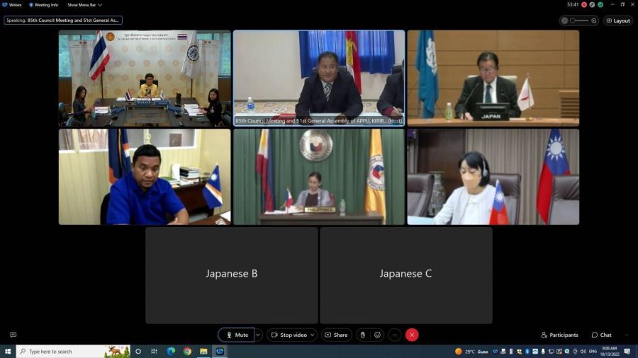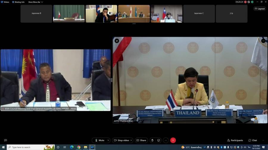 วันพฤหัสบดีที่ 13 ตุลาคม 2565 ณ ห้องประชุม 406 ชั้น 4 อาคารรัฐสภา นางศิรินา ปวโรฬารวิทยา สมาชิกวุฒิสภาและเลขาธิการหน่วยประจำชาติไทยใน APPU ในฐานะหัวหน้าคณะผู้แทนรัฐสภาไทย พร้อมด้วยนางพิชชารัตน์ เลาหพงศ์ชนะ สมาชิกสภาผู้แทนราษฎร และนางสาวจิราพร สินธุไพร สมาชิกสภาผู้แทนราษฎร คณะผู้แทนรัฐสภาไทย เข้าร่วมการประชุมคณะมนตรีสหภาพสมาชิกรัฐสภาเอเชียและแปซิฟิก ครั้งที่ 85 และการประชุมสมัชชาใหญ่ฯ ครั้งที่ 51 (The 85th Council Meeting and the 51st General Assembly of APPU) ในรูปแบบการประชุมผ่านสื่ออิเล็กทรอนิกส์ จากกรุงตาราวา สาธารณรัฐคิริบาส ระหว่างวันที่ 13-14 ตุลาคม 2565