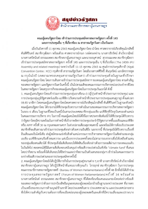 คณะผู้แทนรัฐสภาไทย เข้าร่วมการประชุมสมัชชาสหภาพรัฐสภา ครั้งที่ 145 และการประชุมอื่น ๆ ที่เกี่ยวข้อง ณ สาธารณรัฐรวันดา เป็นวันแรก