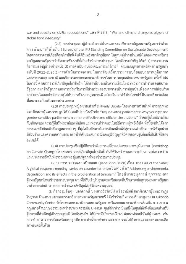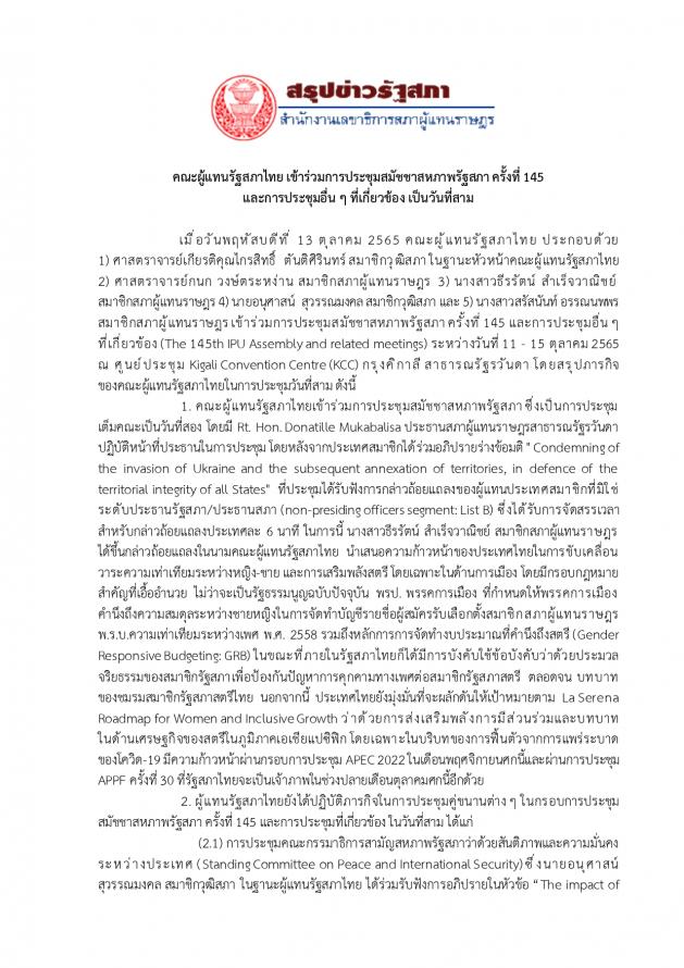 เมื่อวันพฤหัสบดีที่ 13 ตุลาคม 2565 คณะผู้แทนรัฐสภาไทย ประกอบด้วย ศาสตราจารย์เกียรติคุณไกรสิทธิ์  ตันติศิรินทร์ สมาชิกวุฒิสภา ในฐานะหัวหน้าคณะผู้แทนรัฐสภาไทย ศ.กนก วงษ์ตระหง่าน สมาชิกสภาผู้แทนราษฎร นางสาวธีรรัตน์ สำเร็จวาณิชย์ สมาชิกสภาผู้แทนราษฎร นายอนุศาสน์  สุวรรณมงคล สมาชิกวุฒิสภา และนางสาวสรัสนันท์ อรรณนพพร สมาชิกสภาผู้แทนราษฎร เข้าร่วมการประชุมสมัชชาสหภาพรัฐสภา ครั้งที่ 145  และการประชุมอื่น ๆ ที่เกี่ยวข้อง (The 145th IPU Assembly and related meetings) ระหว่างวันที่ 11 - 15 ตุลาคม 2565 ณ ศูนย์ประชุม Kigali Convention Centre (KCC) กรุงคิกาลี สาธารณรัฐรวันดา