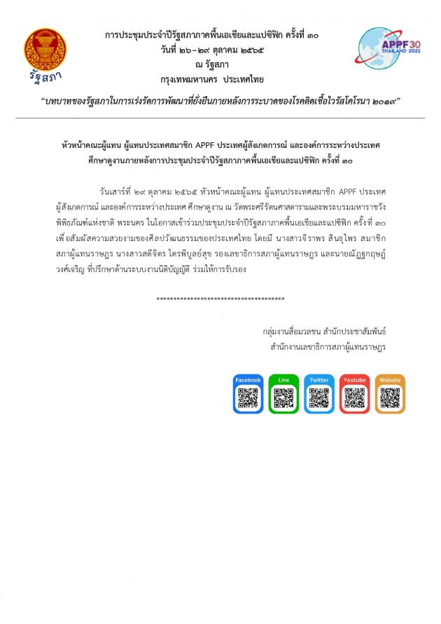 วันเสาร์ที่ 29 ตุลาคม 2565 หัวหน้าคณะผู้แทน ผู้แทนประเทศสมาชิก APPF ประเทศผู้สังเกตการณ์ และองค์การระหว่างประเทศ ศึกษาดูงาน ณ วัดพระศรีรัตนศาสดารามและพระบรมมหาราชวัง พิพิธภัณฑ์แห่งชาติ พระนคร ในโอกาสเข้าร่วมประชุมประจำปีรัฐสภาภาคพื้นเอเชียและแปซิฟิก ครั้งที่ 30