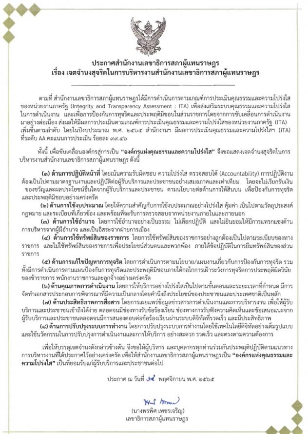 จากนั้น เป็นการลงนามคำรับรองการปฏิบัติราชการฯ ระดับสำนักระหว่างรองเลขาธิการสภาผู้แทนราษฎร ที่ปรึกษา ผู้อำนวยการสำนัก โอกาสนี้ นางพรพิศ เพชรเจริญ เลขาธิการสภาผู้แทนราษฎร ประกาศเจตจำนงสุจริตในการปฏิบัติราชการแก่คณะผู้บริหารของสำนักงานฯ เพื่อให้บรรลุเจตจำนงขอให้ผู้บริหารและบุคลากรทุกท่านร่วมกันประพฤติปฏิบัติตามแนวทางการบริหารงานที่ได้ประกาศไว้อย่างเคร่งครัด ทั้งนี้ เพื่อให้สำนักงานเลขาธิการสภาผู้แทนราษฎรเป็น "องค์กรแห่งคุณธรรมและความโปร่งใส" เป็นที่ประจักษ์แก่ผู้เข้ารับบริการและประชาชน และมีความพร้อมที่จะรับการตรวจสอบการปฏิบัติงานตามเจตจำนงสุจริตที่ได้แสดงไว้ต่อไป |