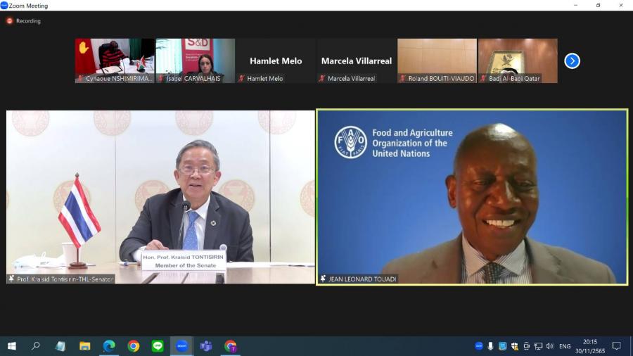เมื่อวันพุธที่ 30 พฤศจิกายน 2565 เวลา 19.00 - 21.30 นาฬิกา ตามเวลาประเทศไทย ศ.เกียรติคุณ ไกรสิทธิ์ ตันติศิรินทร์ สมาชิกวุฒิสภา ได้รับเชิญเข้าร่วมการประชุมเตรียมการก่อนการประชุมสุดยอดของภาครัฐสภาว่าด้วยการขจัดความหิวโหยและภาวะทุพโภชนาการระดับโลก ครั้งที่ 2 ของสหประชาชาติ (Pre-Summit meeting: Developments and challenges towards the Second Global Parliamentary Summit against Hunger and Malnutrition) ผ่านสื่ออิเล็กทรอนิกส์ ซึ่งจัดขึ้นโดยองค์การอาหารและการเกษตรแห่งสหประชาชาติ (Food and Agriculture Organization of the United Nations: FAO) ร่วมกับสถาบันนานาชาติเพื่อการพัฒนาที่ยั่งยืน (International Institute for Sustainable Development :IISD) โดยมีวัตถุประสงค์เพื่อเป็นเวทีในการเตรียมการด้านเนื้อหาสารัตถะผ่านการแลกเปลี่ยนองค์ความรู้และความคิดเห็นในการสานเสวนาทางการเมืองเกี่ยวกับบทบาทของสมาชิกรัฐสภาในการส่งเสริมความมั่นคงด้านอาหารและโภชนาการ เพื่อเตรียมความพร้อมสำหรับการประชุมสุดยอดภาครัฐสภาว่าด้วยการขจัดความหิวโหยและภาวะทุพโภชนาการระดับโลก ครั้งที่ 2 ที่จะมีขึ้นในปี 2566